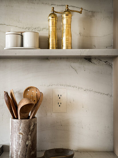 Christensen used a solution from Trufig on a recent project for which the brand created a plate to match his Luce di Luna quartzite backsplash. And while camouflaging the outlet wasn’t as expensive as the fancy slab of stone itself, it is an investment. Flanigan estimates it typically costs $300 to $500 per outlet. “So choose your location wisely!” she warns. “I would consider hiding any outlets that truly take away from the overall design.”