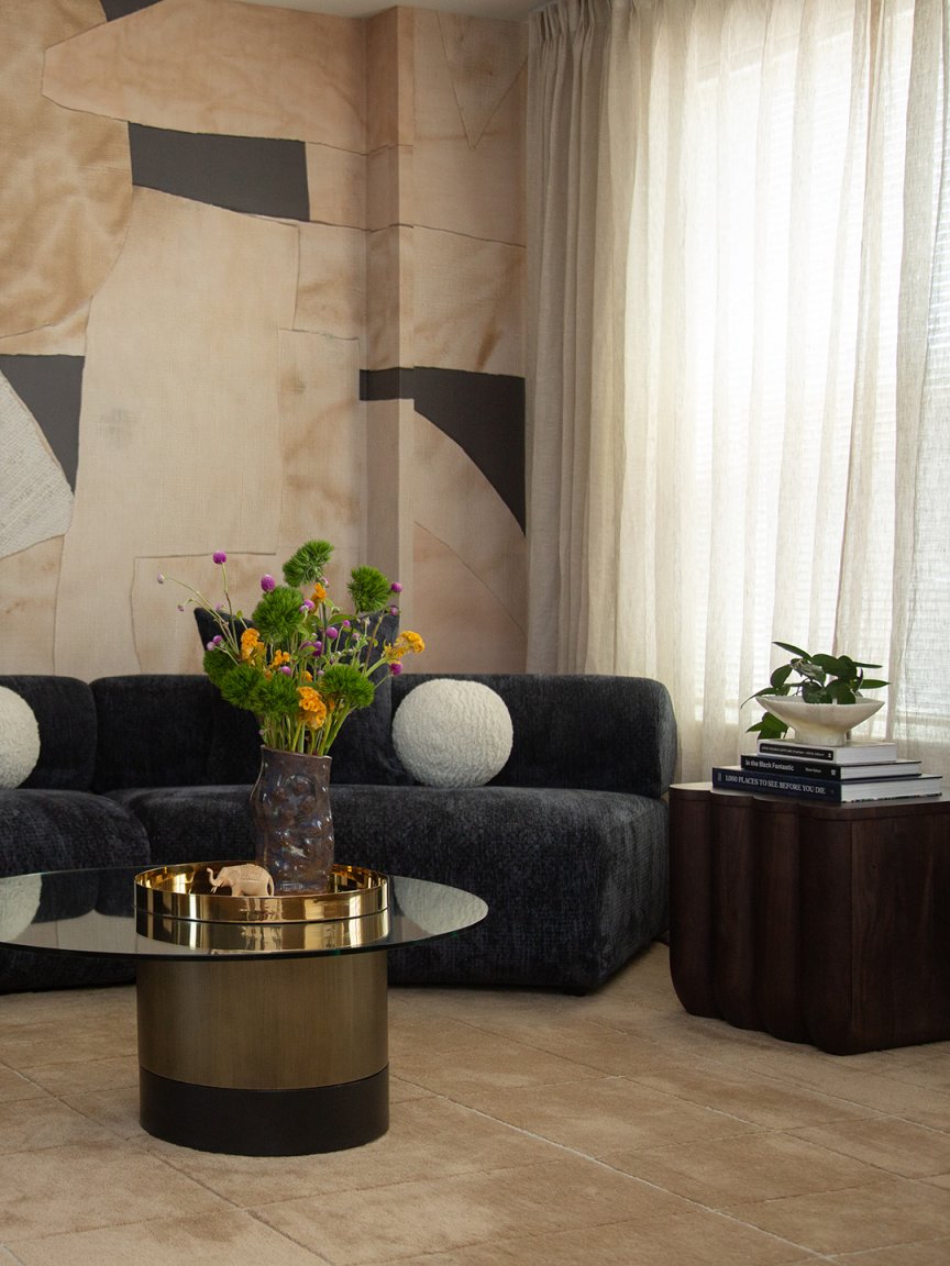 Brown and her sister like to travel together, so they played off the idea of making this living room feel like the lobby of a boutique hotel. “We didn’t want the type of living room where she would cuddle up and watch TV—that wasn’t what we grew up with,” the designer says. Instead, they imagined this as a semi-formal space for lounging and entertaining friends.
