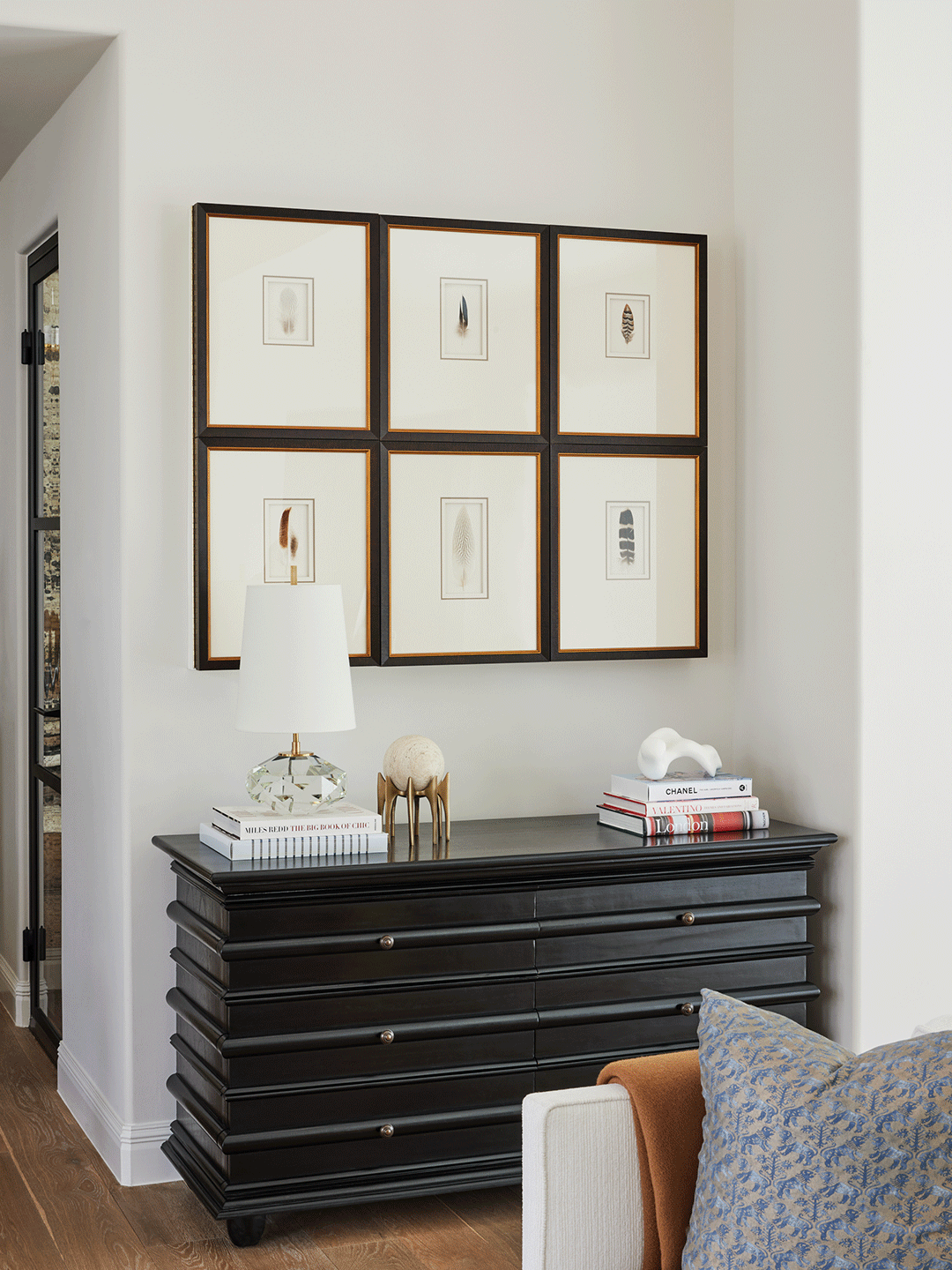 Pulp Design Studios made a clever hideaway for a client’s rarely used television by setting the screen into the wall and adding “doors” on either side. When closed, all guests see are six works of art in matching frames.