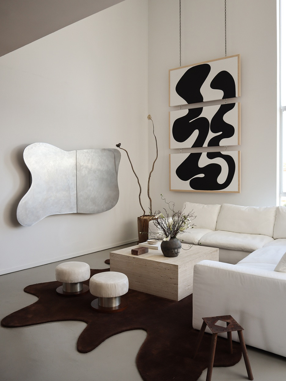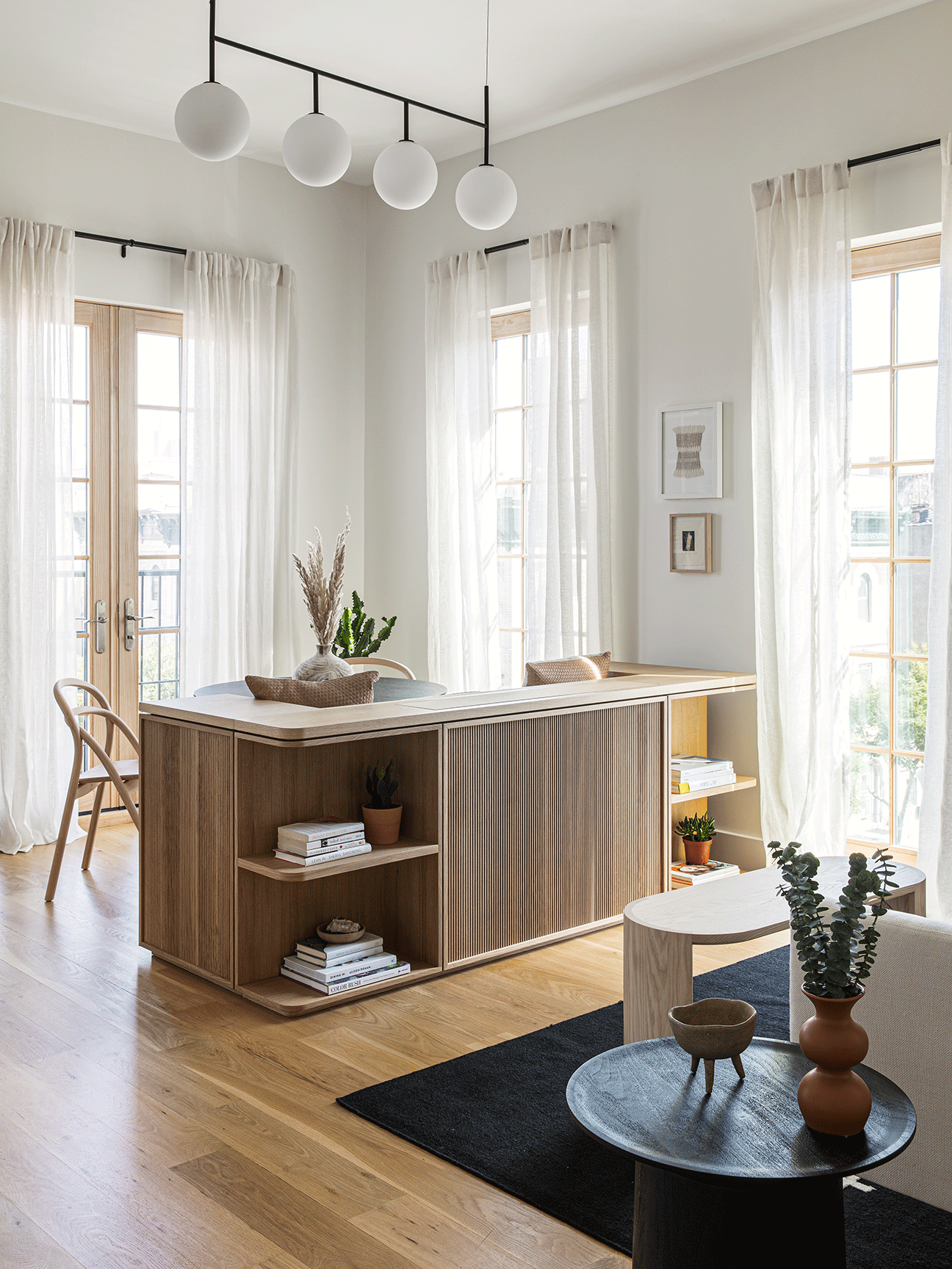 After realizing this apartment only had one wall available for artwork, designer Charlotte Sylvain of Studio Fauve decided to position the TV in the middle of the room. The custom floating dining banquette–meets–media console comes with a remote-controlled lift that conceals (or reveals) the flat screen at the touch of a button.