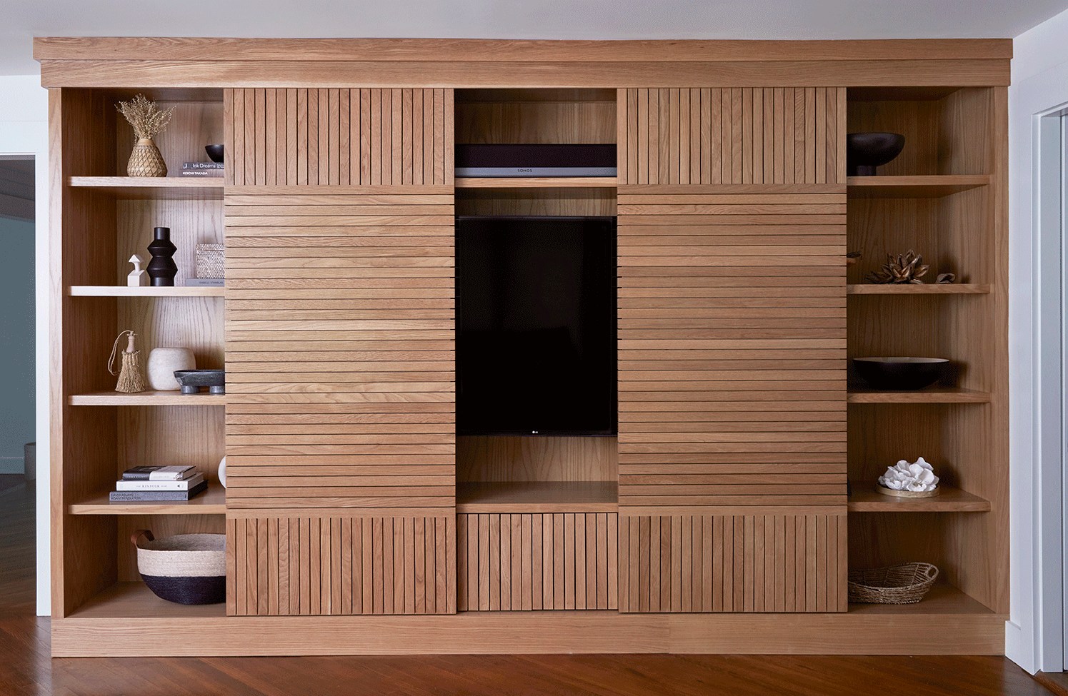 Built out of solid white oak, the unit in Alex Simons’s Austin home cleverly hides a TV behind a wide, tight-woven cane sliding screen. And that’s not the only thing this system disguises. The tall door next to it is a coat closet.