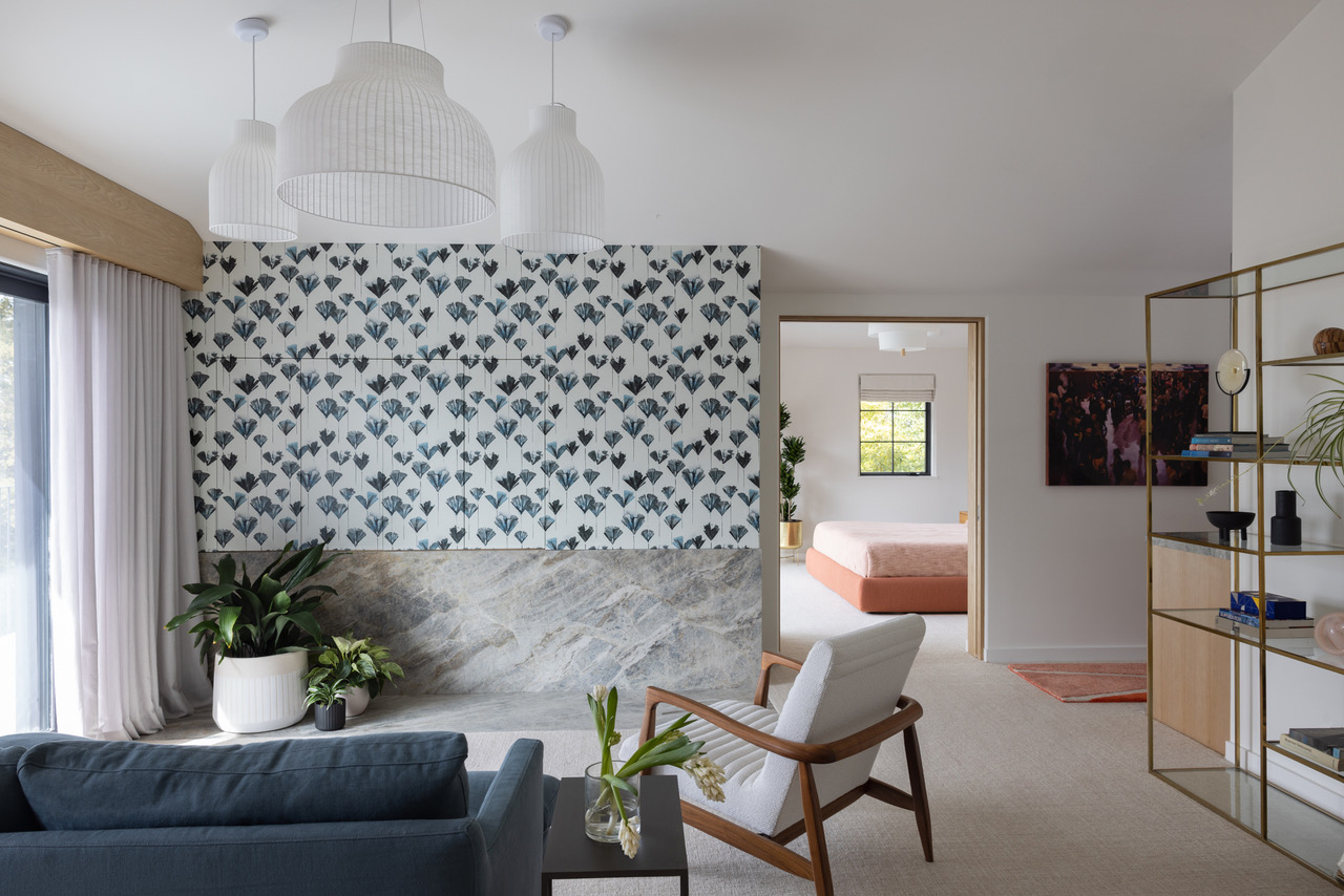 The flush TV cabinet and wall in this Oakland Hills, California, home, designed by Medium Plenty, is swathed in Elworthy Studio’s Botanica print. Looking at the treatment is almost as thrilling as watching a murder-mystery show: The artist created a series of poppy flowers by dipping an art blade into ink and making layered petals with one hand and spraying water onto the paper with her other hand. The ink and water interact differently each time, resulting in a fluid motif.