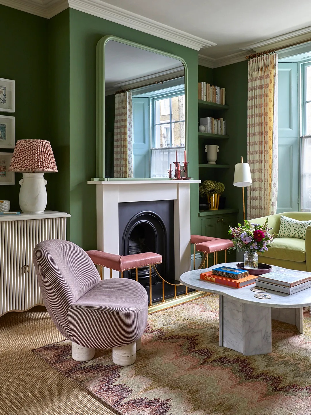 In this cocooning green space, what looks like a mirror is actually a television screen concealed behind reflective glass from a British company called Overmantels. The addition is proof that design compromises can be reached between couples with different feelings on how necessary a TV is in a formal living room.