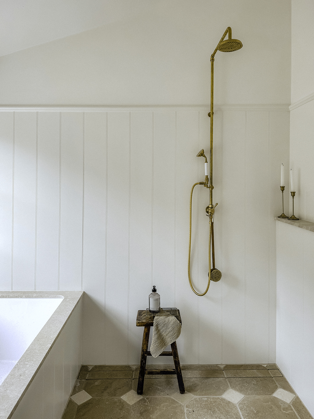 Before installation, Ryley and the builder cut holes in the boards for plumbing and fixtures. The panels were then sanded, primed, and painted to match the rest of the space, and installed beneath a rail to enhance the illusion of real wood. Paired with brass fixtures, tiled floors, and a coordinating shower ledge, the bathroom is now coming together just as Jenn envisioned.