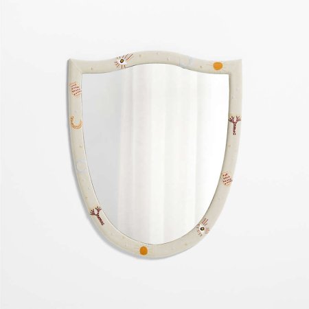 The hand-embroidered illustrations on this mirror’s upholstered frame—a Joshua tree, a watchful eye, and more—are important symbols in Brent’s life, and the piece’s unique shape stems from his love of French mid-century design. “It felt playful and young but still sophisticated,” he says.