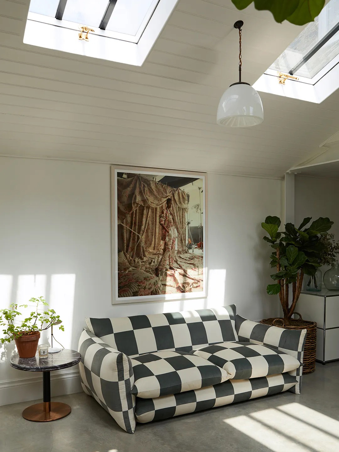 Buchanan Studio founders Charlotte and Angus Buchanan have concrete floors and stainless steel cabinets and yet their kitchen is the epitome of warmth. Why? In addition to plopping two traditional table lamps on top of their island, they parked their checkerboard velvet Studio Sofa across from the stools. By hanging a large photograph by Alex Bramall above the couch, it makes its placement in the kitchen feel purposeful and not like they just forgot to move it out of the room on move-in day.