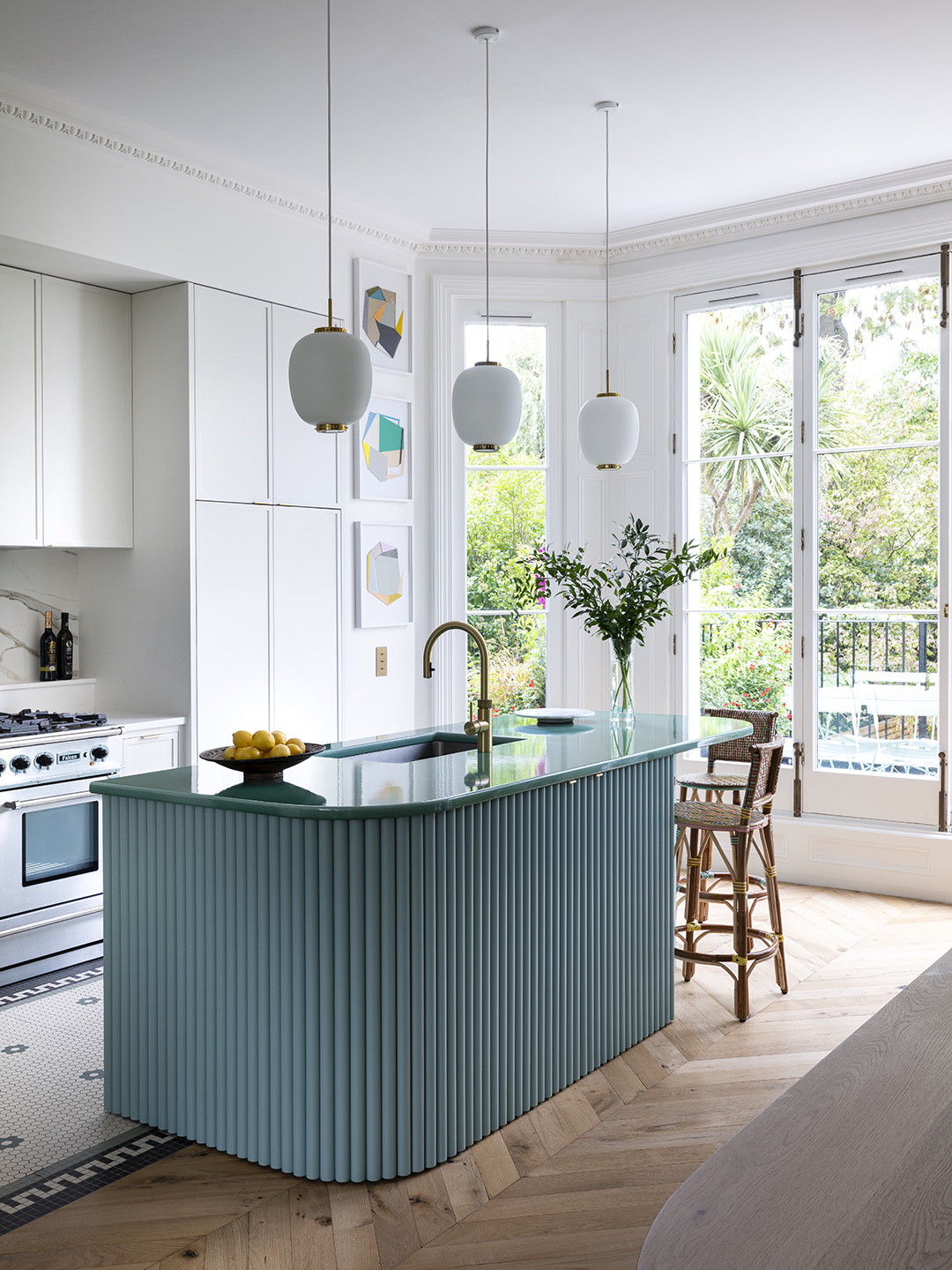 “Most people now don’t really want their kitchens to look like kitchens,” Katie Glaister, the cofounder of K&H Design, says of her decision to go with the unexpected material for this London home’s kitchen island. The aqua is a much-welcome hit of color in a space where gray cabinets dominate.