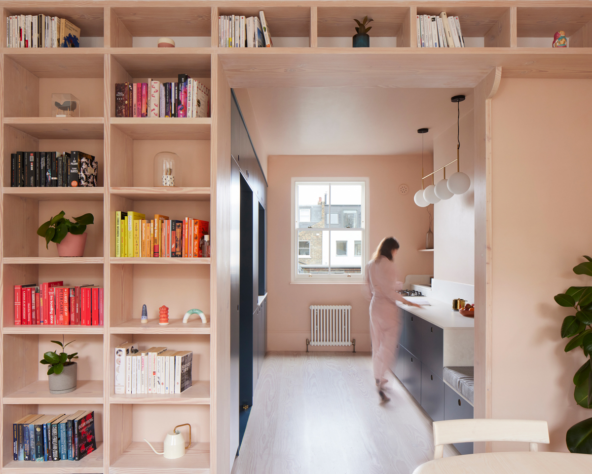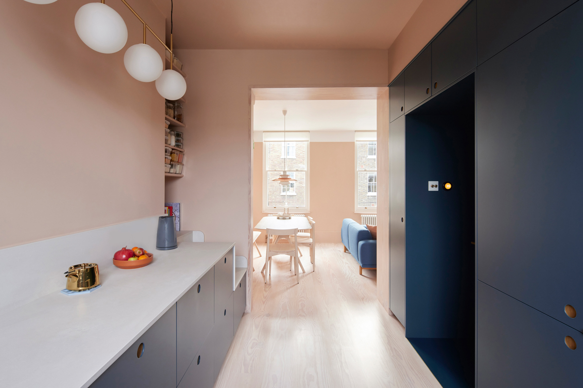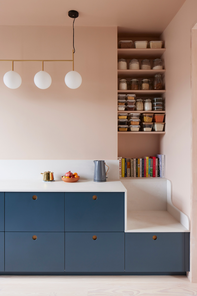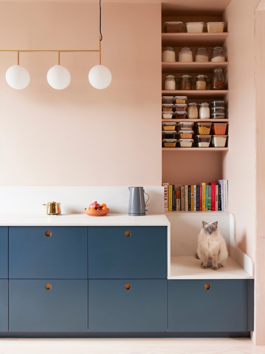 There is such a thing as the best seat in the house. And for Josh Piddock, founder of Studio Merlin, and his girlfriend, Margot, that spot is in the couple’s 130-square-foot galley kitchen, right below the shelves of dry goods and above the drawer where they stash their cat Allen’s food. “One of us uses the seat every day,” says Josh. “It’s a great space to have a coffee and read a book, sit and watch the projector in the living room, or boringly check emails.” The brilliance of the 2-by-2-foot seat is that it doesn’t soak up any extra floor space: It’s built into the lower cabinetry.