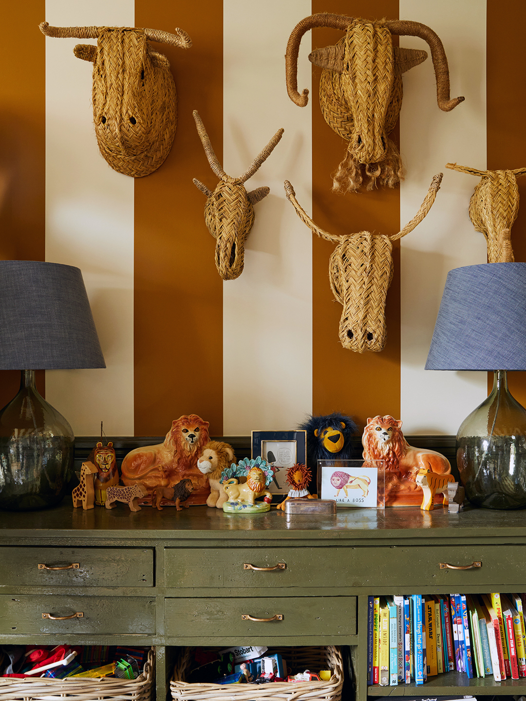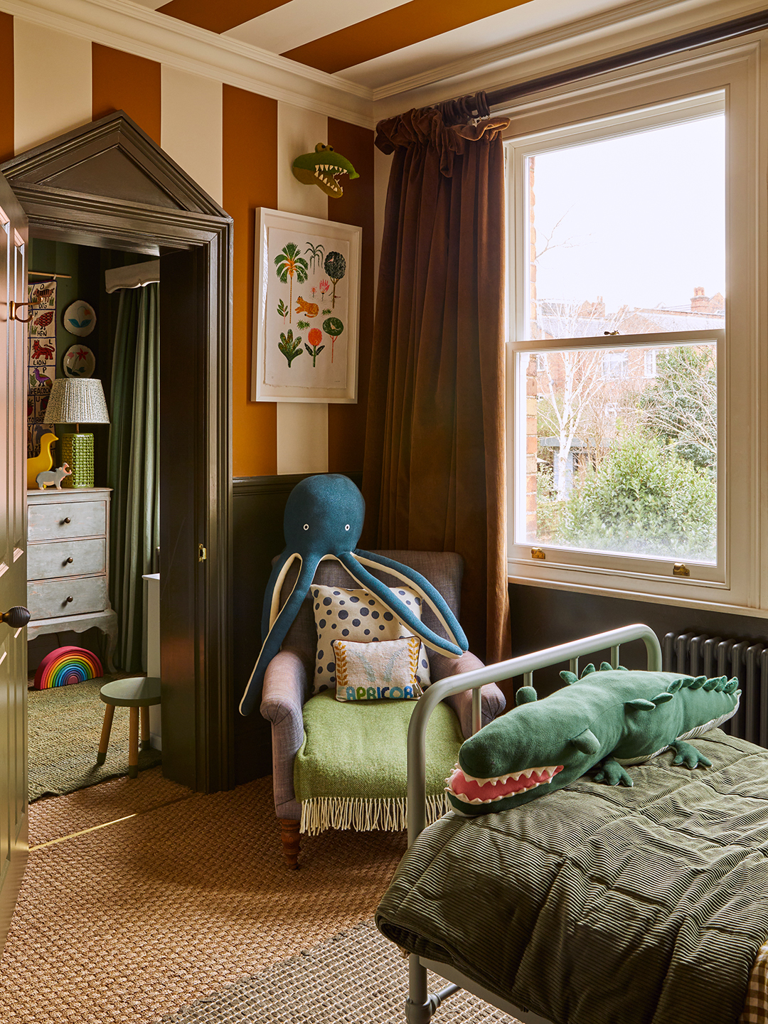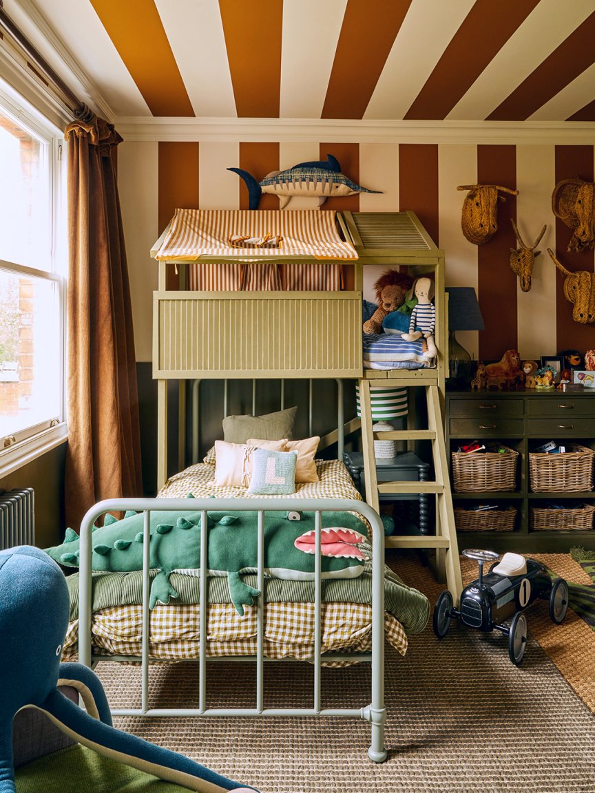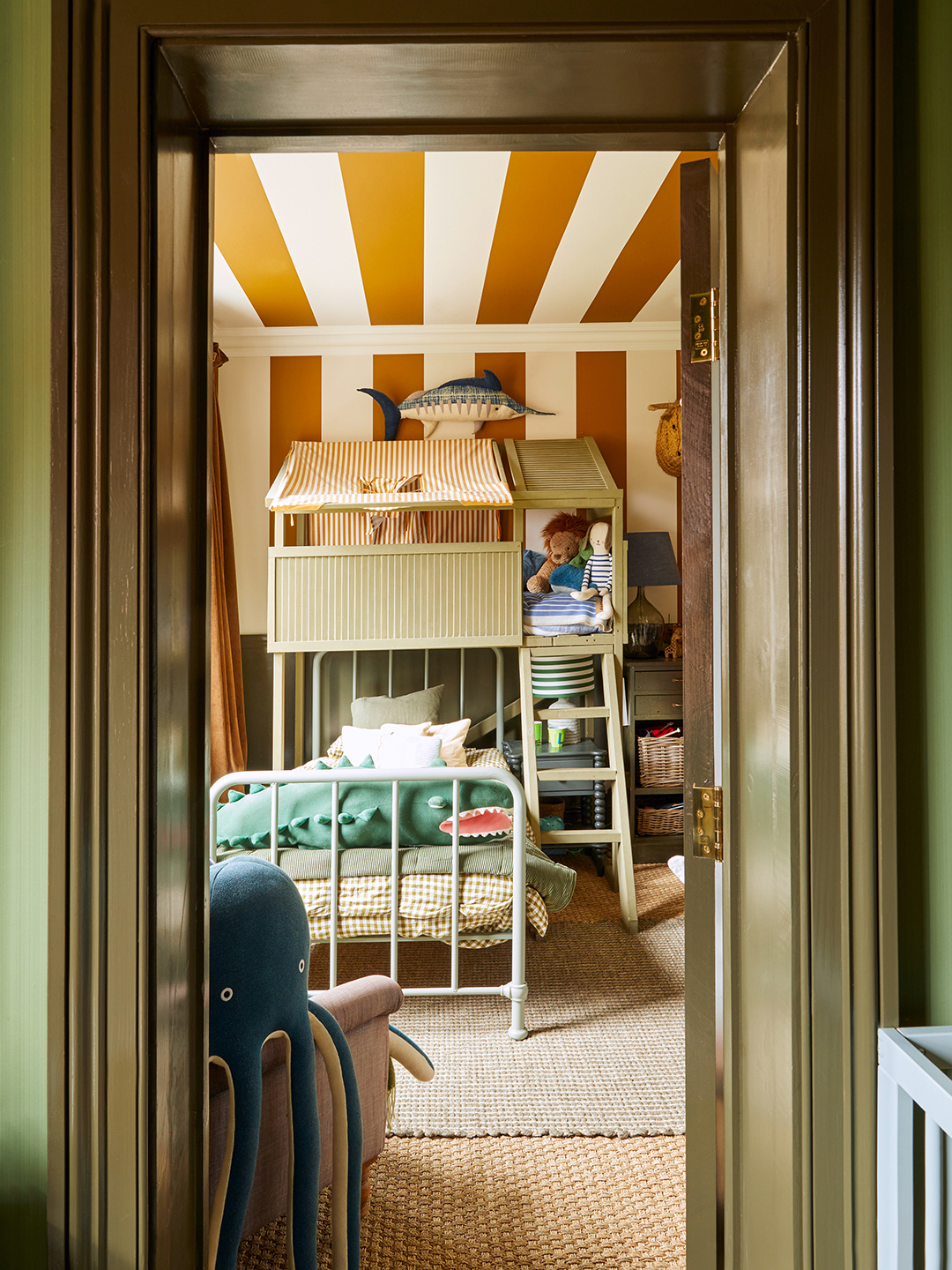 Naturally, her children’s playroom in the family home, used by Lyon (5) and Nancy (4), received the stripes treatment, too. “We knew we’d be spending as much time there as the kids, and I think there’s a way of making it exciting for your child and also aesthetically nice for you,” says Sarah. She indulged Lyon’s love of green with a slick of forest-hued paint below the dado rail—and when the space became his bedroom (owing to a reshuffle after the arrival of Celeste, now 2), it took on another exciting transformation with a bed like no other and more magical details.