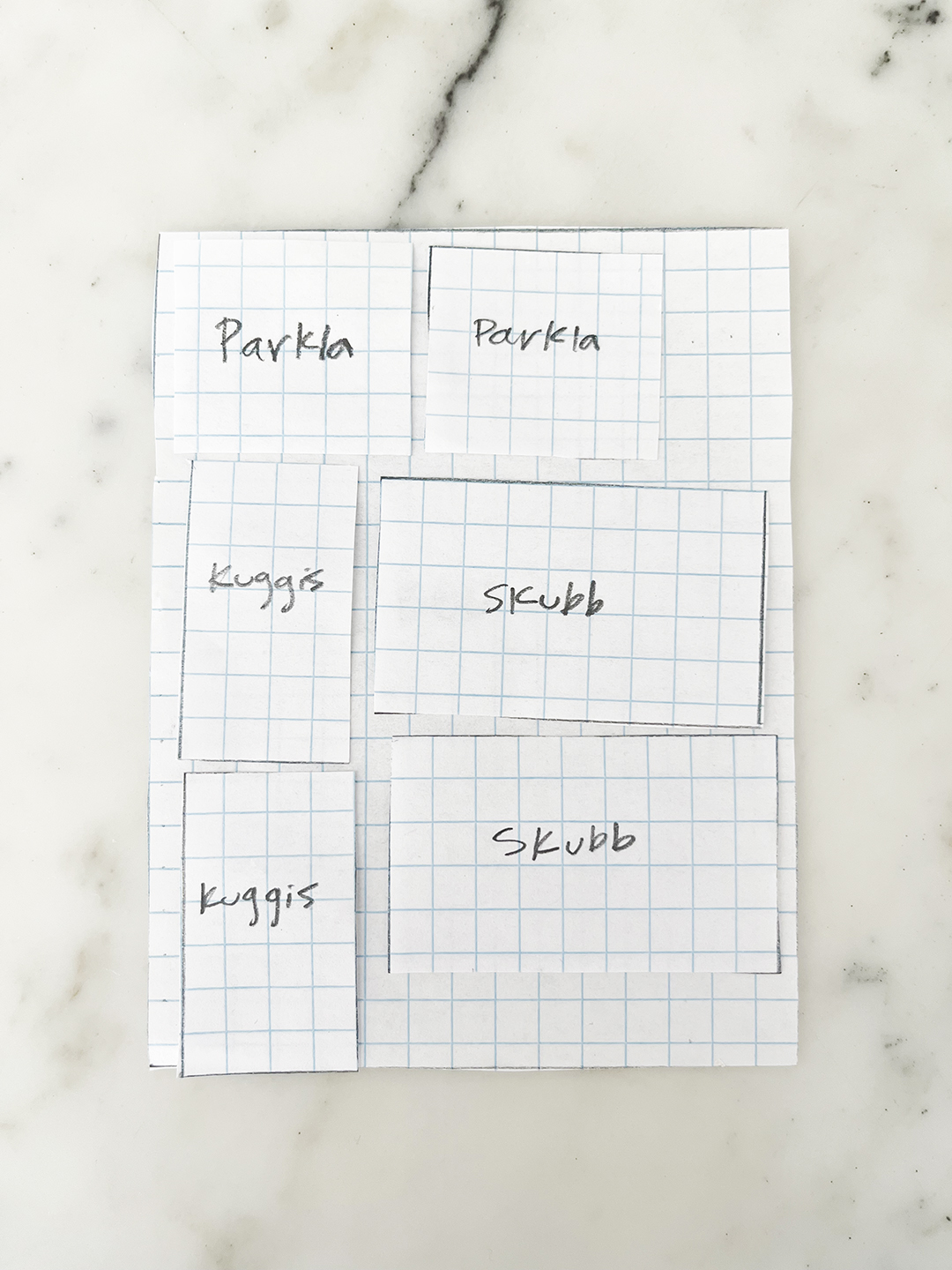 So what goes where? I started intuitively, putting anything that was soft and flexible (table linens, bedding, pillow inserts) in the fabric containers, and any hard objects, like books and extra taper holders, in the structured Parkla boxes. Because the Skubb boxes are the largest (they’re 36.5-by-21.75-by-7.5 inches), I saved them for bigger items like towels, and relegated smaller collections like tote bags to the Parkla containers. The nice thing about the soft containers is that they’re both sheer, so I don’t need to waste brain space remembering what is where.