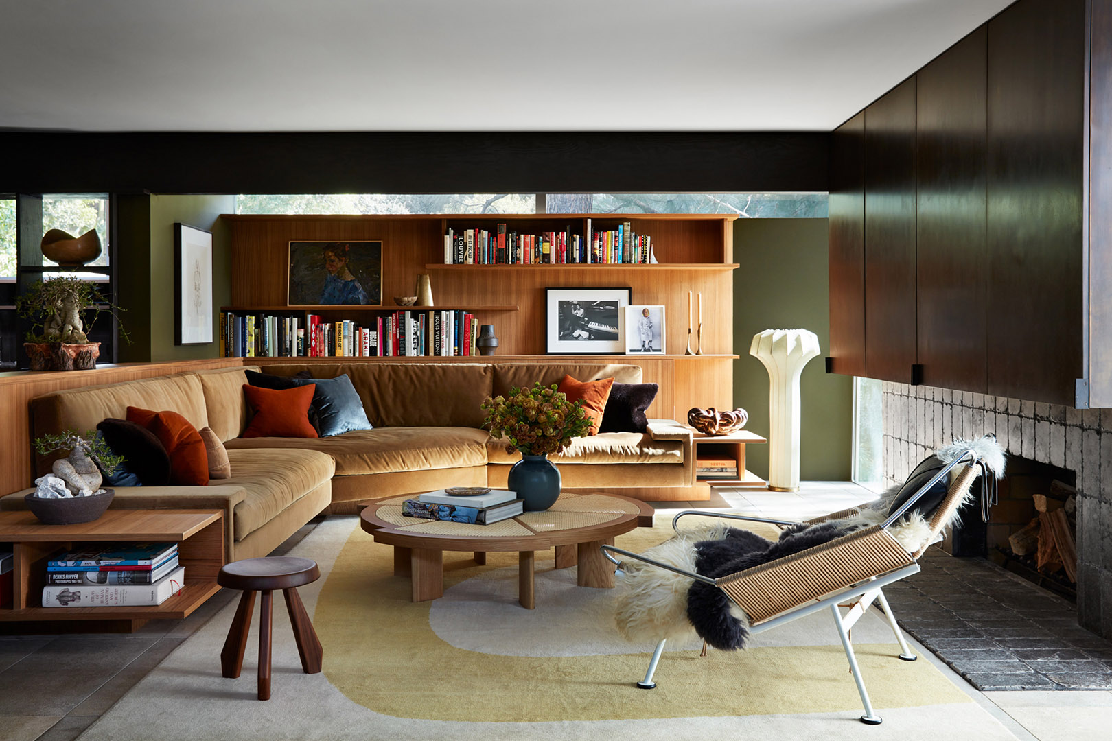 The design (and brother-sister) duo behind Shamshiri Studio, Pamela and Ramin, fulfilled one client’s quest for a post-divorce refresh with a renewed take on a mid-century modern residence dating back to 1961. First, they stained the posts and beams an almost-black to highlight the architecture. Next, they opted for an off-white stone floor to bounce light up into the dark rooms. Finally, they chose Benjamin Moore’s Turtle Green for the walls to bring the outside in while fostering a sense of nurturing calm.