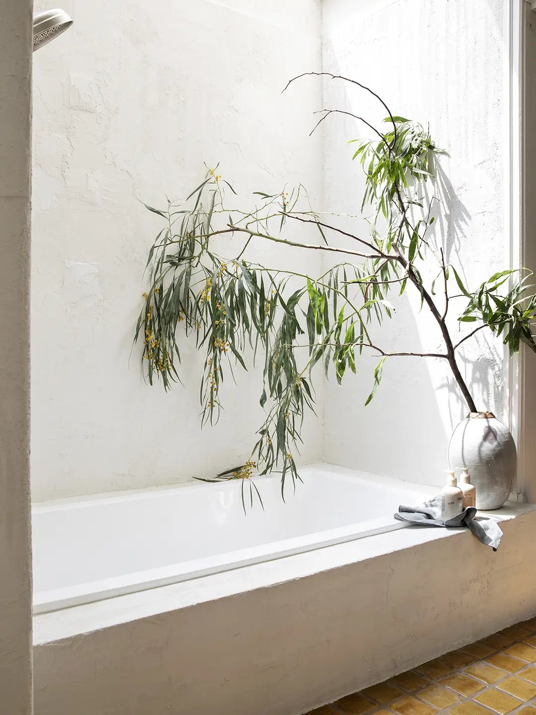 The idea behind this L.A. bathroom was ease: You can hop underneath the showerhead without stepping over a curb or moving a sliding door. The only time you have to crouch down is when you want to get into the Madre Perla stone–clad tub. “You’re able to have that European spa bathhouse feel,” says Alison Wilson, one of the home’s designers.