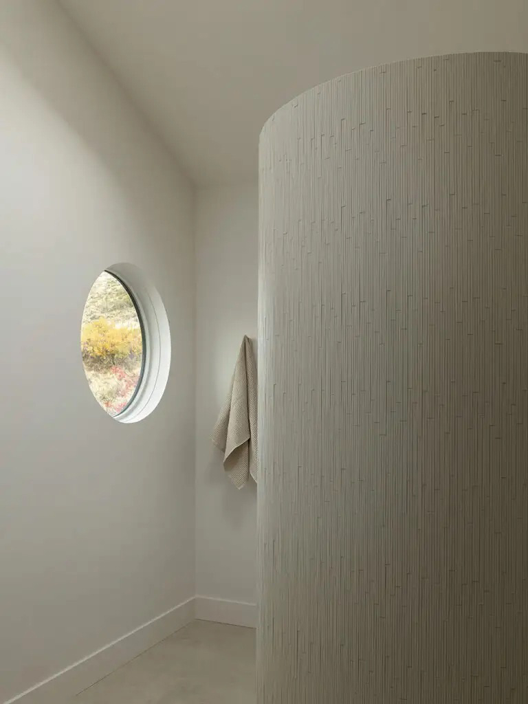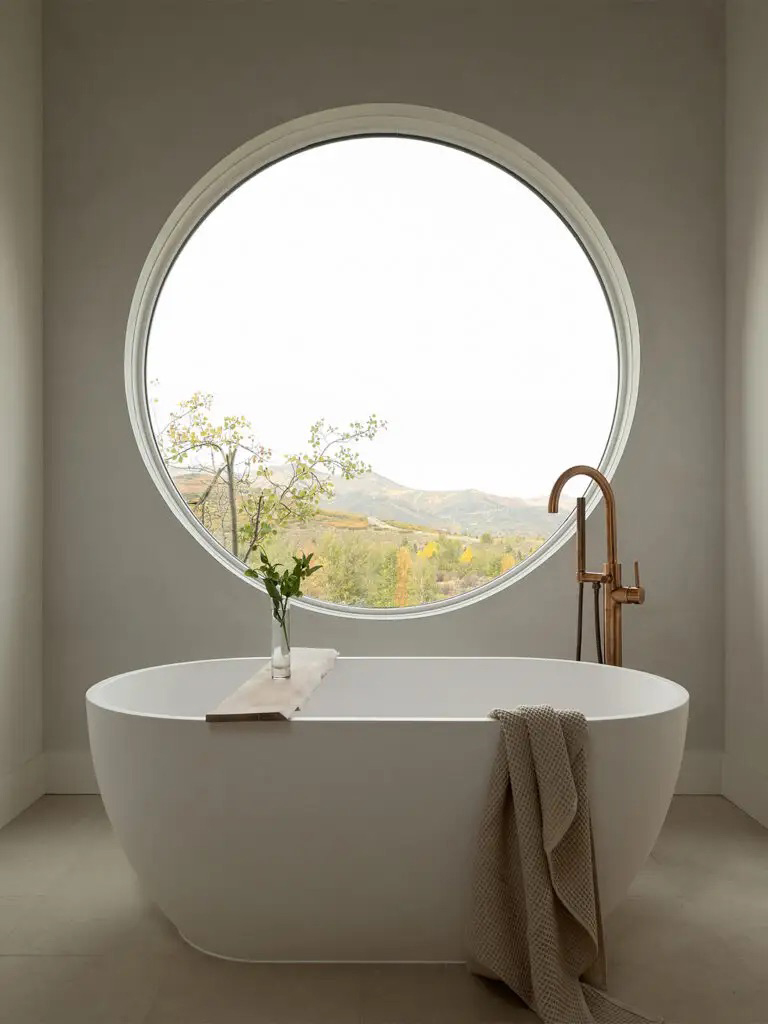 Scratch that maximalist itch with exaggerated shapes. In this Park City, Utah, bathroom, an enormous round window and curved shower wall clad in chalky white Stone Source tile create the wow factor.