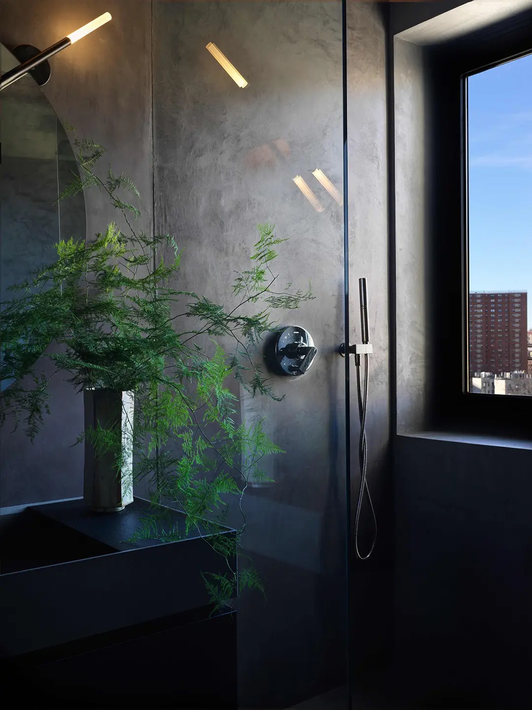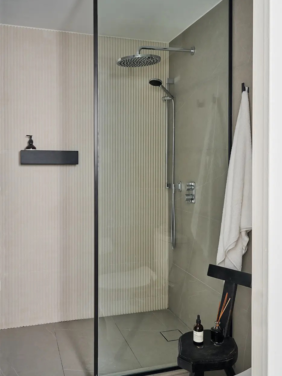 In case you needed another reminder that not all minimalist bathrooms need to be white, peep film director and visual artist Loïc Maes’s space, designed by architecture firm Re-ad. The different tones of black lend a sense of depth to the room, and they continue down to the stained concrete floors and even up to the ceiling, which happens to be painted a medium gray hue.