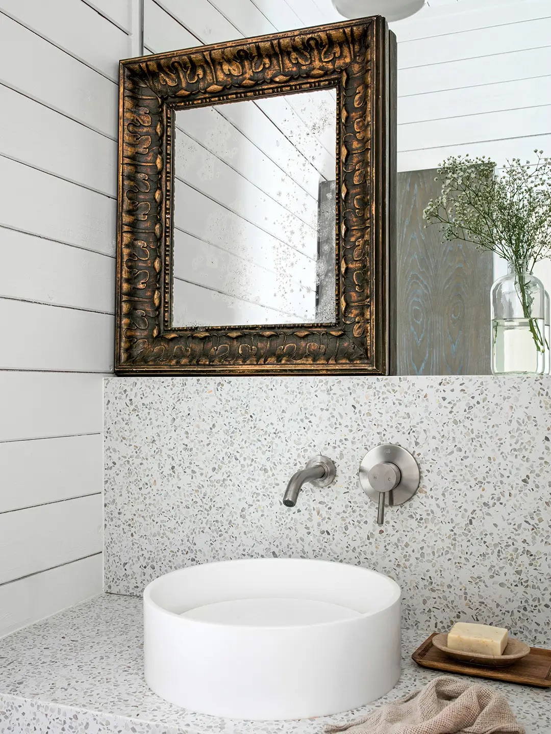 Maybe it’s because homeowner Cheryl Mainland describes her style as “industrial beach chic,” or maybe it’s because her son’s name is Cobalt—either way, her medicine cabinet ended up with a lick of blue around the base and on the handle. The detail introduces some much-needed personality to what otherwise could feel like a sterile space without being overwhelming.