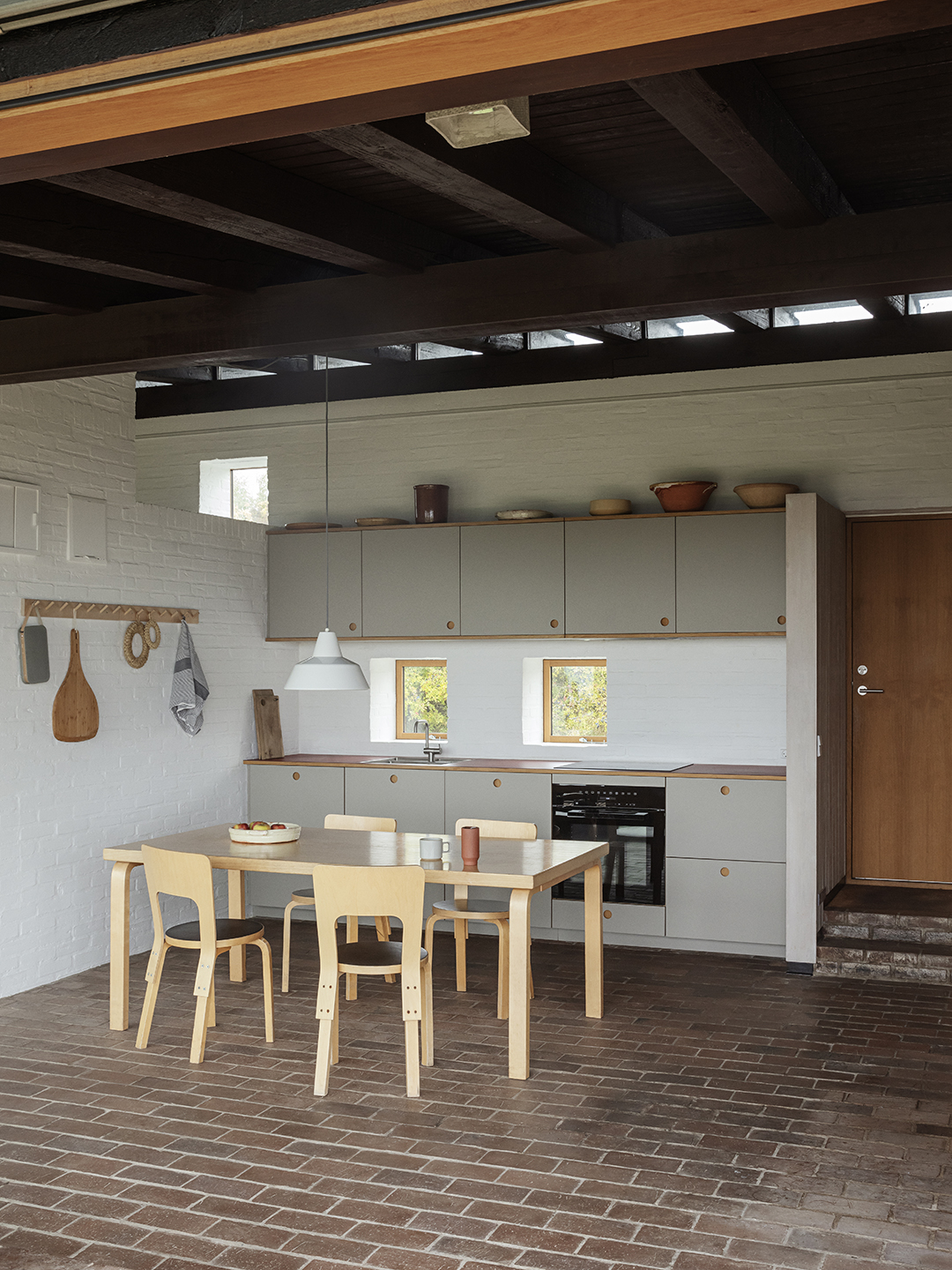When Marimekko chief creative director Rebekka Bay and her husband, Ricky Nordsøn, cofounder of Nord & Sand, bought their Denmark summer house, the 1972 kitchen was still standing, complete with its original appliances. To keep their refresh of the space from looking too new, they stuck with the same single-wall layout, then modernized the finishes. The linoleum cabinets trimmed in natural oak paired with a red linoleum countertop remind the design-minded couple of the work of Alvar Aalto, Jean Prouvé, and Charlotte Perriand.