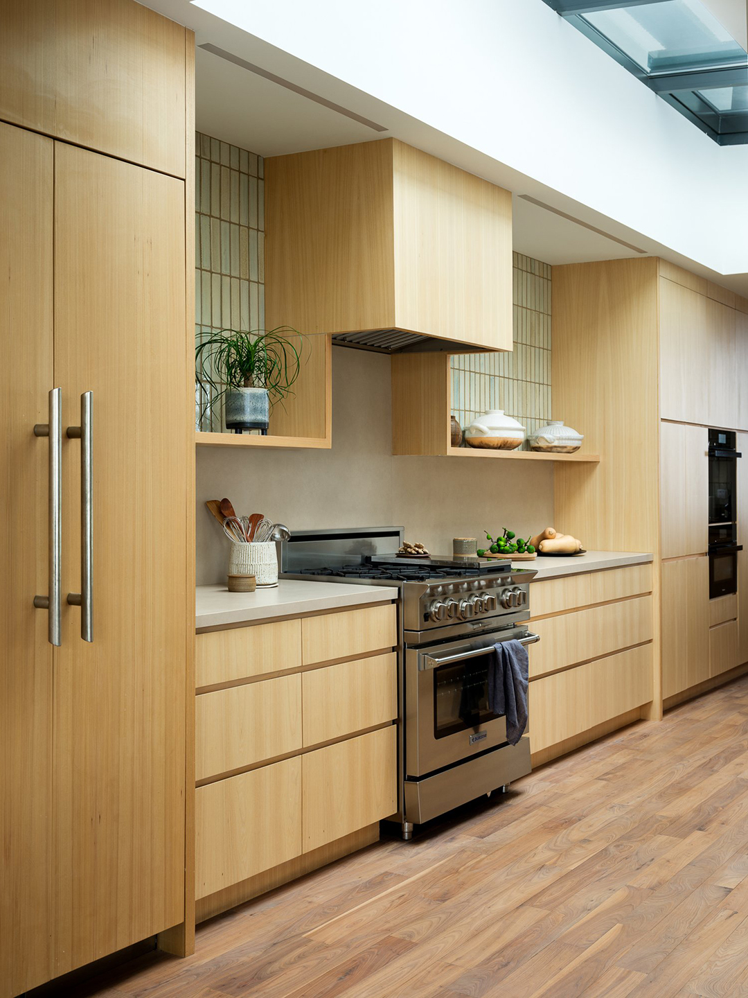 The eye is inevitably drawn to a shiny metal vent smack-dab in the middle of the room. So we say box it in. For this San Francisco home, designer Noz Nozawa chose California-sourced grey elm for the cabinetry, open shelving, and range hood surround, a variety that has a “quiet wood grain reminiscent of Japanese Hinoki cypress,” she says.