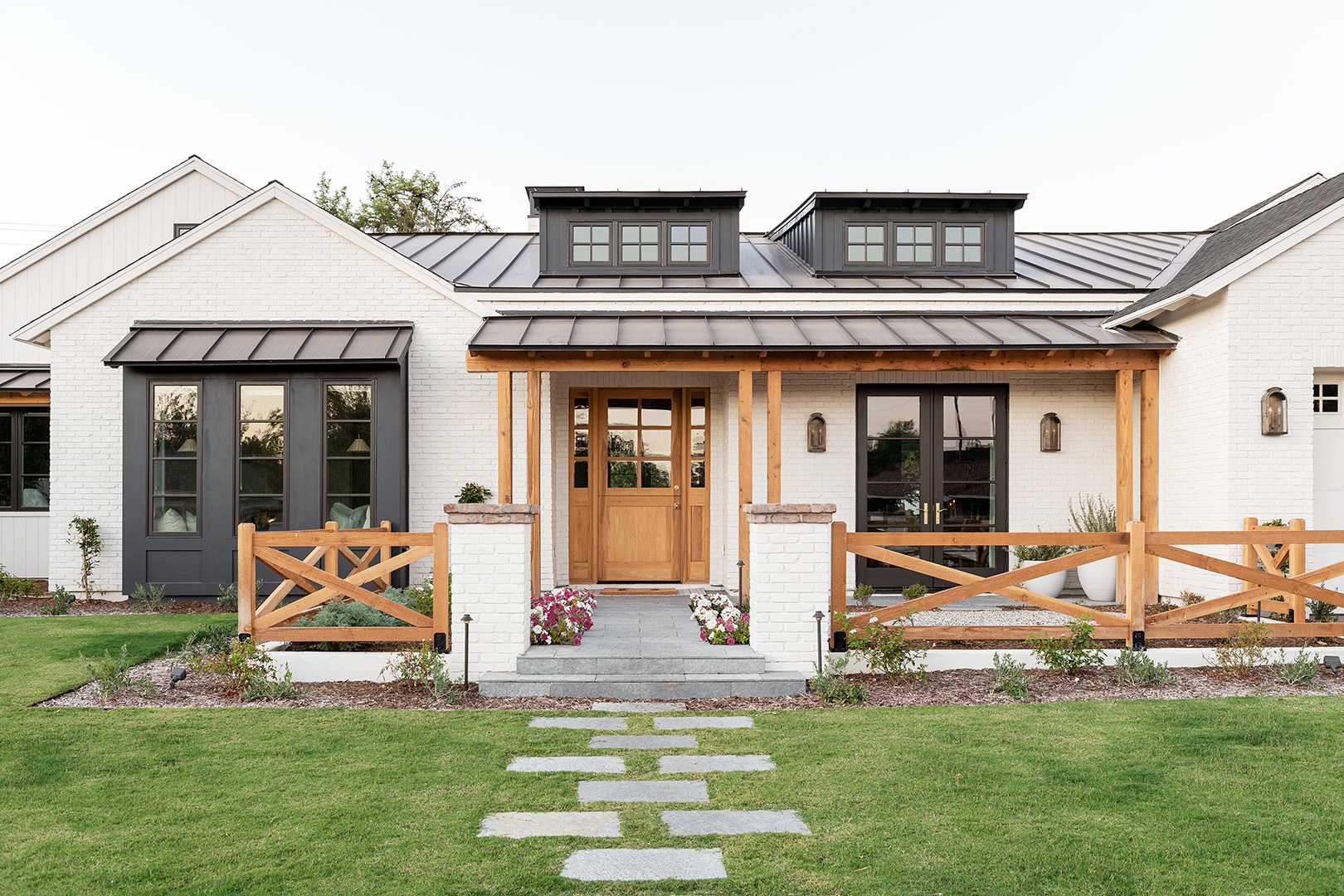 Studio McGee cofounder Shea McGee’s favorite part about this ground-up project in Arizona? The dark bronze dormer windows and corrugated metal roof—two touches that help balance out the sea of white painted brick while accentuating the front porch and garden.