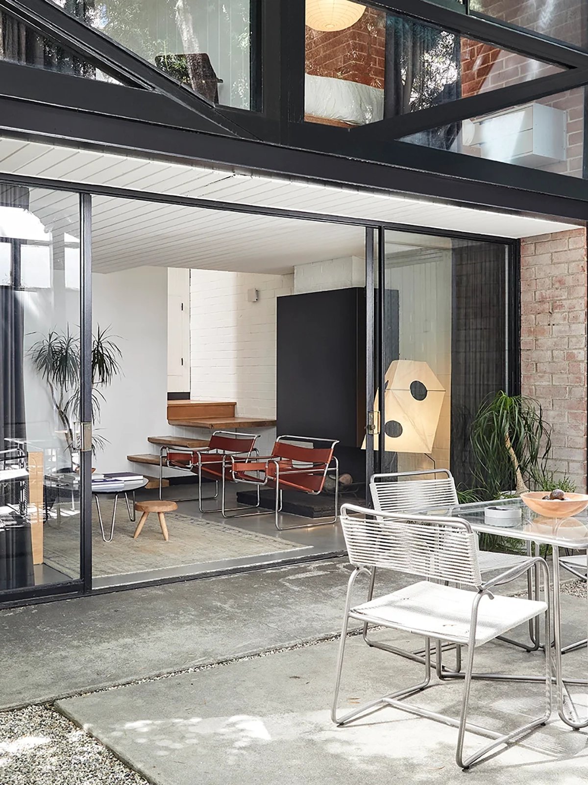 One look at this modern house exterior and you may recognize it as a creation of Craig Ellwood, the famed architect known for his minimal steel-and-glass designs. Erin Starkweather’s unit, one of three in this Hollywood apartment building, pairs angled lines (a hallmark of Ellwood’s architecture) with floor-to-ceiling sliding glass doors that encourage oh-so-L.A. indoor-outdoor living.