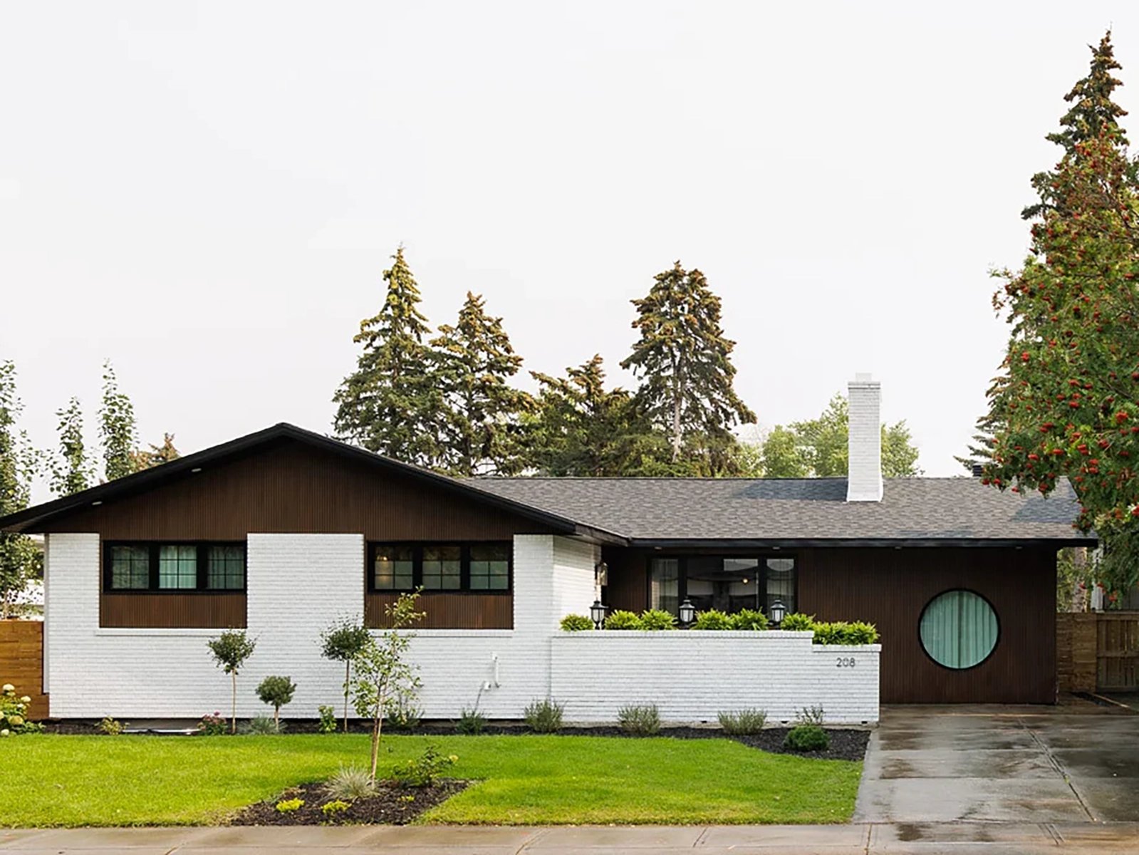 When Canadian designer Alykhan Velji and his partner, Jason, moved into their 1959-built bungalow, its orangey red brick and white siding screamed mid-century—but not in a cool way. To give its architecture a 2023 edge, the designer painted the brick white and added sections of a walnut-hued facade by NewTech that could fool anyone into believing it is wood. (It’s not; it’s made out of durable recycled plastic.) The pièce de résistance, however, is the eye-catching circular window, an ultra-modern feature that tends to stop neighbors in the street.
