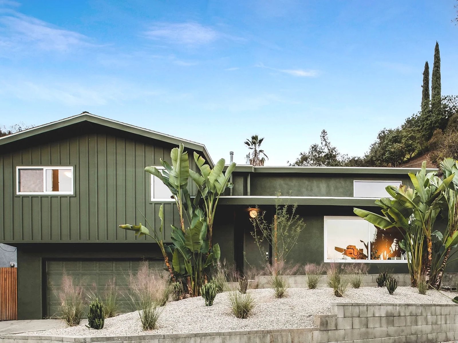 This isn’t your average 1960s split-level—not anymore, at least. When architecture firm Part Office reimagined this house, located in the Eagle Rock neighborhood of Los Angeles, creating a cohesive flow of the mismatched additions was at the top of the must-do list. That goal extended to the outdoors, so picking fresh paint for the facade was essential, too. The homeowners landed on this earthy hue (now called Mountain Olive from Behr), which allows this modern house exterior to appear as one with its steep hillside surroundings.