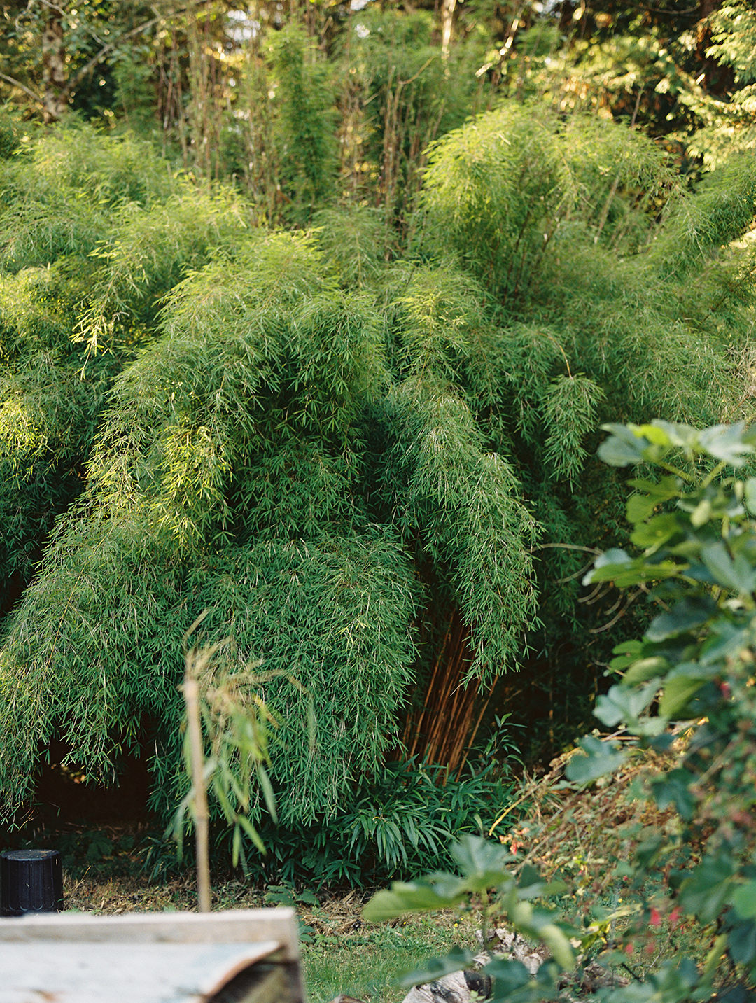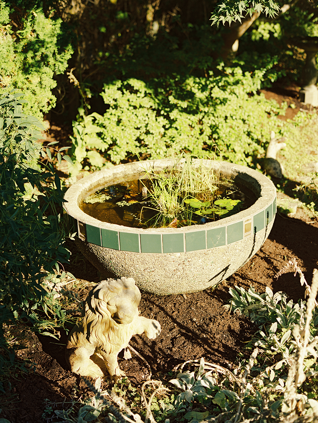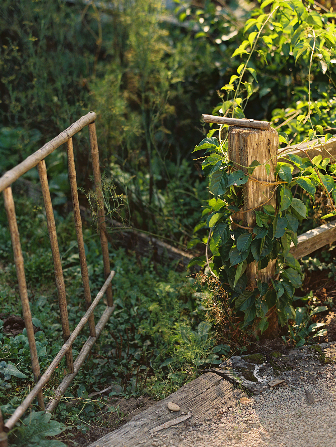 Molly: My parents used upcycled stone, wood, bamboo poles, found basins. Materials used to landscape the garden were not shiny, but found and already with a patina, often native to the land. My dad built all of the gates out of the dried bamboo poles, then made the latches to keep the deer out from the shorter broken pieces.