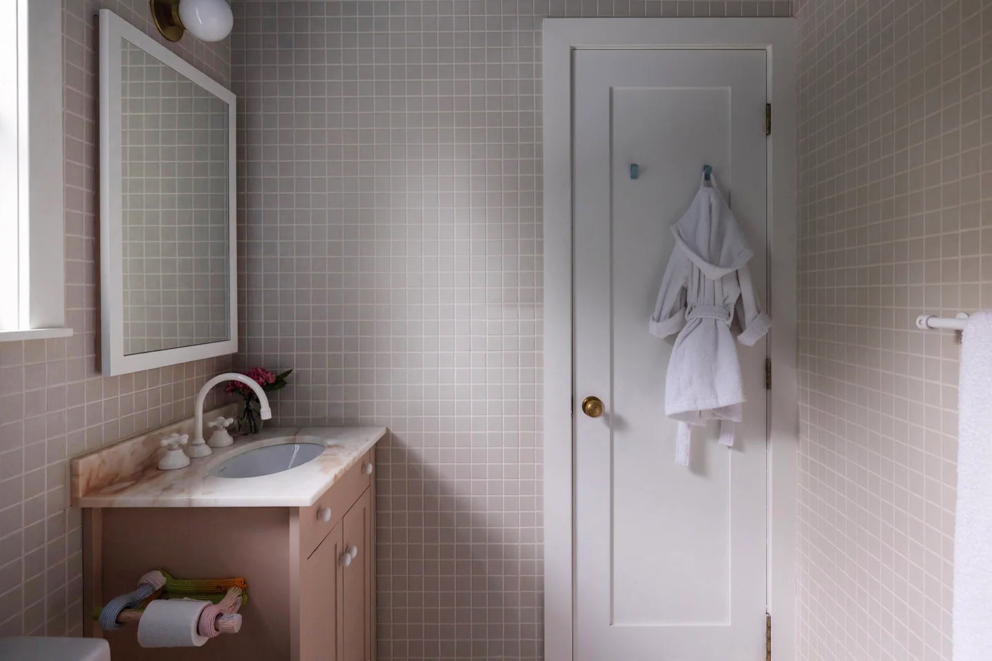 Pastel blue squares give this small but mighty kids’ bathroom in Jill Singer’s Hamptons home mid-century appeal. Knowing damp towels might get left on the floor or toothpaste residue smudged on the walls by her little ones, her designers at White Arrow opted for a full wet room of sorts by continuing the mosaic on all four walls—up to the ceiling.