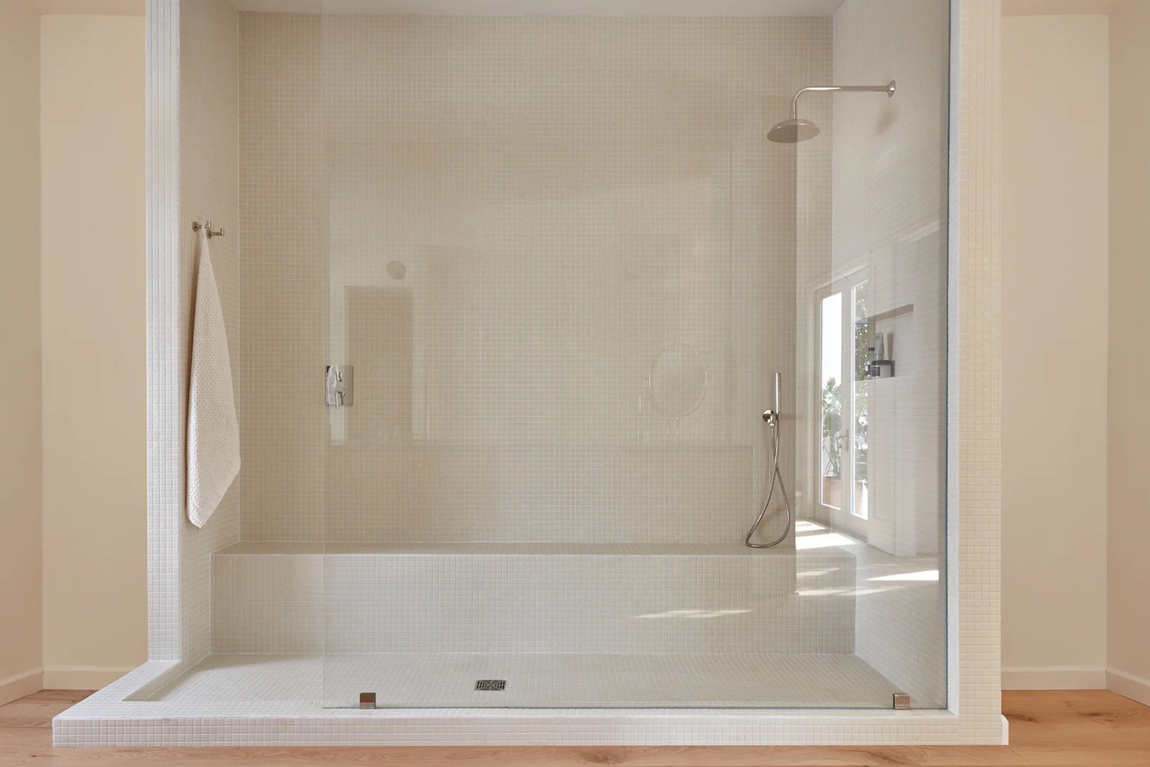 Designer Shannon McLaren’s nearly Kim Kardashian–size shower exudes 1990s cool with its micro-size beige mosaic tile. The best part about going with this style is that you can get it from nearly any retailer (McLaren bought hers through Fujiwa Tiles, which is known for its pool tile collections).