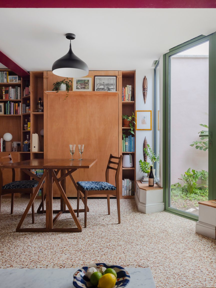 Visiting friends and family would be sporadic, but nevertheless, the owners wanted more options than their spare room or a potential pull-out bed. So, Attanayake figured out how to fit this robust wishlist within this modest extension—and did so well, in fact, that guests might miss their sleeping arrangements upon arrival. A Murphy bed is set into the wall-to-wall bookcase that unites the living and dining areas, hiding behind a textural sheet of stained plywood that faces the sunken kitchen.