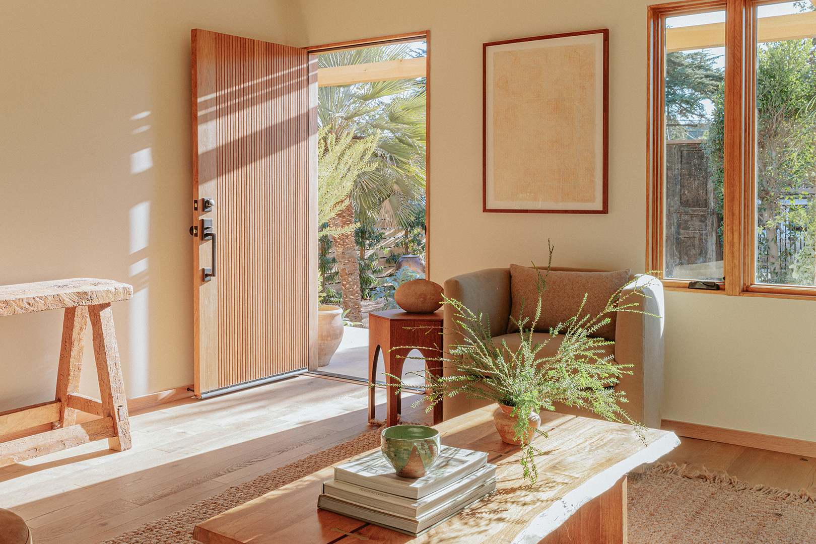 A narrow bench or stool right by the door creates a landing spot for shoes, bags, and guests putting things down when they arrive. Even a small piece signals that you’re passing through a threshold, not heading right into the middle of the living room.