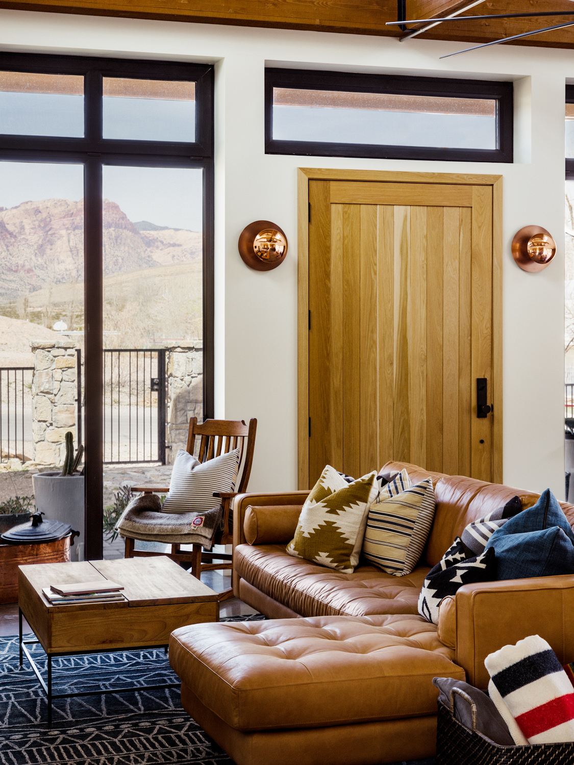 A rug visually creates a drop zone where one doesn’t technically exist. Place a durable entry rug or mat just inside the door, then transition to your larger living room rug beyond it. The subtle shift helps organize the space and keeps dirt contained. If you don’t want to double up on rugs, simply using one in the area segmented as living room space will help separate the different zones.