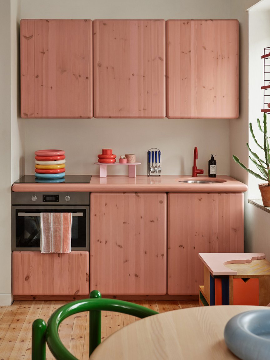 Matching your upper cabinets to your lower ones will make your single-wall kitchen look intentional, but if you want to take it a step further, bring the countertop into the conversation like Westman did. The designer opted for a faint pink stain so the character of his pine doors still shines through. The only essential not pictured is his refrigerator located around the corner.