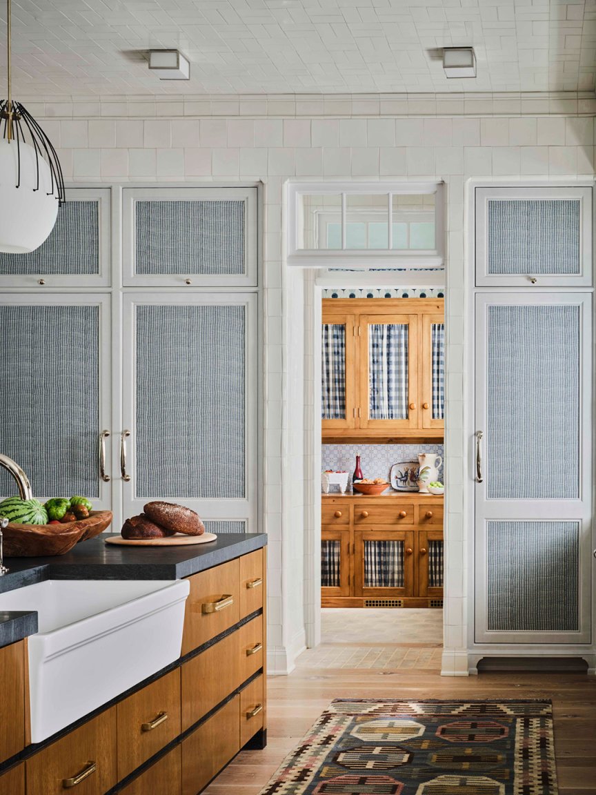 You don’t often see upholstery in a kitchen aside from the occasional café curtain or dining banquette. Jessica Jubelirer is out to change that. In this space, she swathed the panels of the double-door refrigerators in painterly blue checks—the same textile she used to line the kitchen cabinets so that the whole space is cohesive.