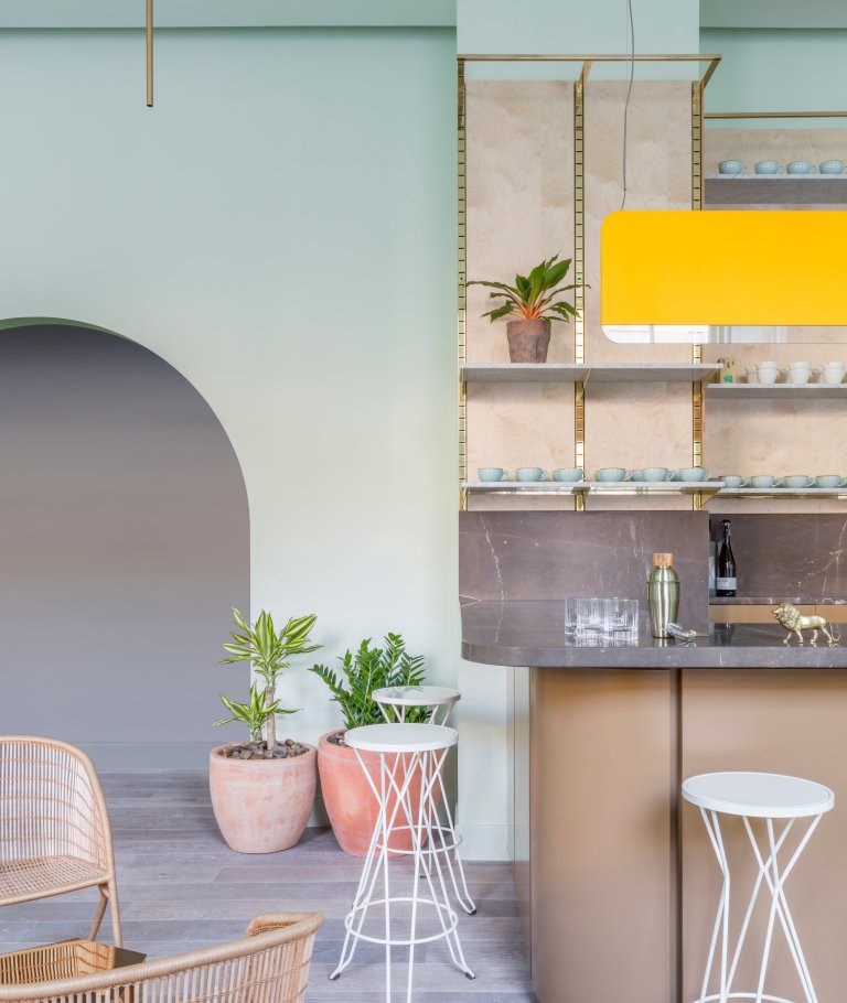 Sage-obsessed folks, this one is for you. The London space balances timelessness and living in the moment with a mix of green wall cabinets and a playful salmon-tinged island.