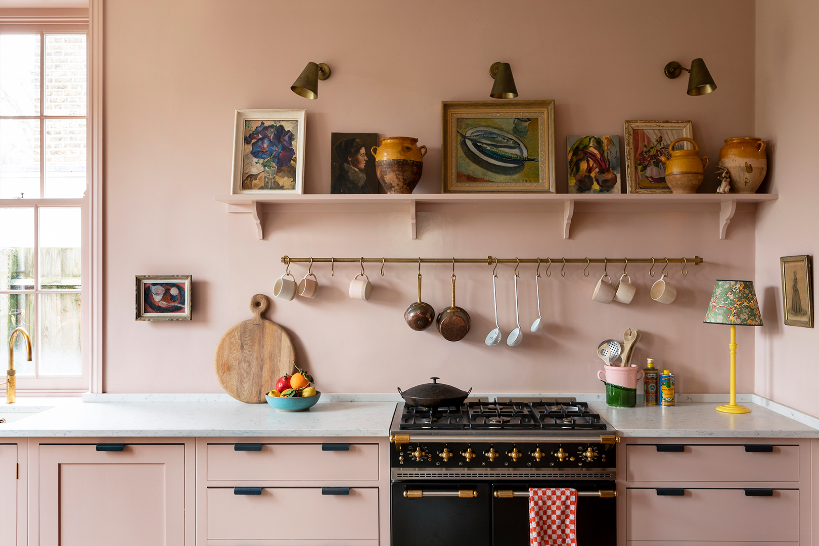 U.K.-based designer Sarah Brown tasked Plain English Kitchen with her space’s design, which involved mounting an open shelf above the range where she can display her golden-hued confit pots. Between the miniature paintings, countertop lighting, and dainty row of mugs (also blush!), this well-loved kitchen turns the trend into a classic.