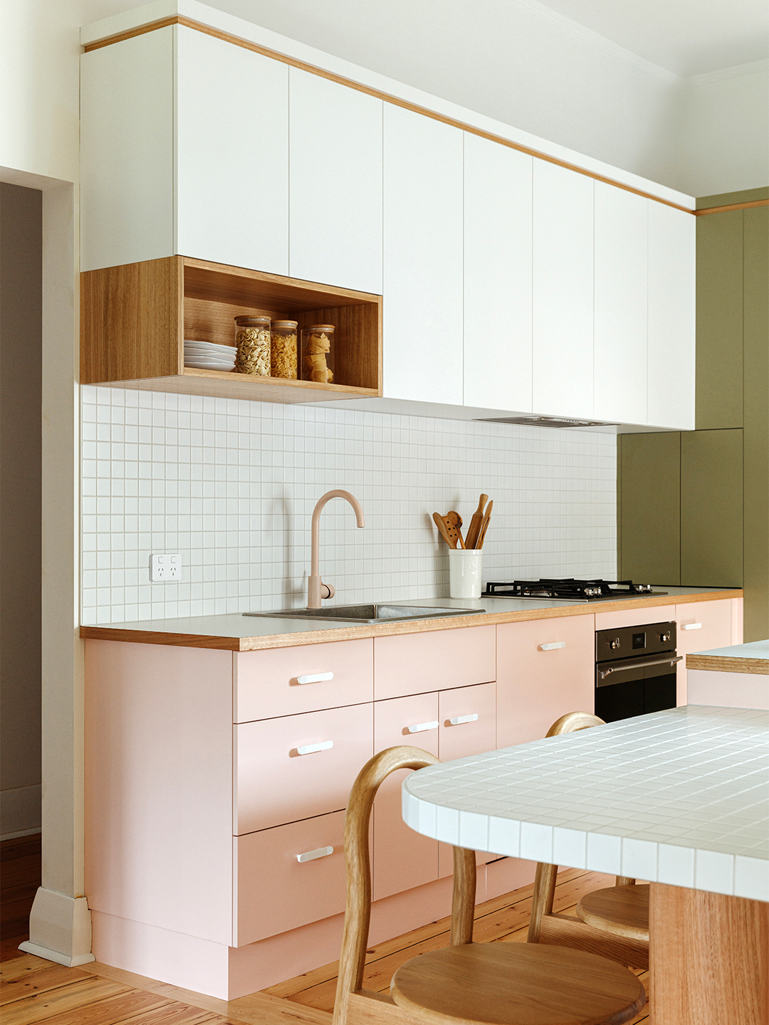 After seeing a candy-colored kitchen Space Craft Interiors & Joinery had designed for a client back in 2018, this Australian family asked for a similar treatment—this time with melamine cabinets and a sink faucet that perfectly matches the durable doors below.