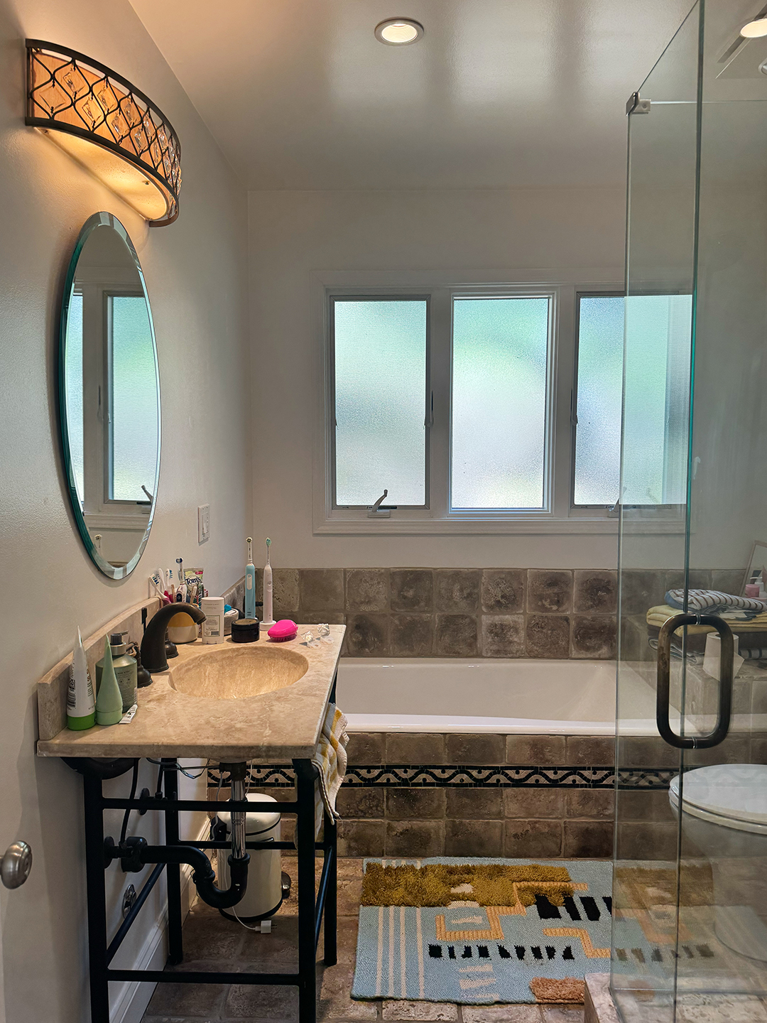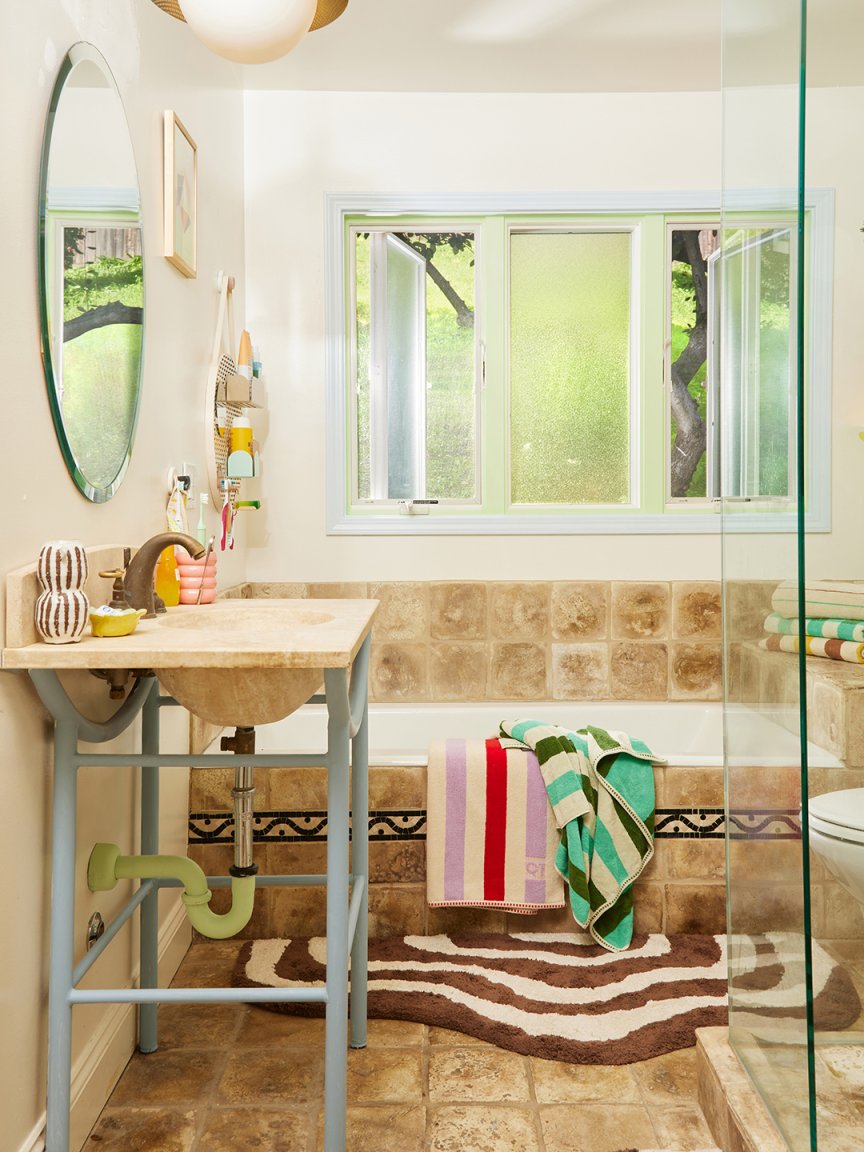 “There’s definitely beauty that you can pull out of your existing bathroom,” Fine proclaims. “If you inherited a color, no matter what it is, dig in!” In her case, with earthy hues underfoot and a window looking out onto trees, why not make it feel practically outside?