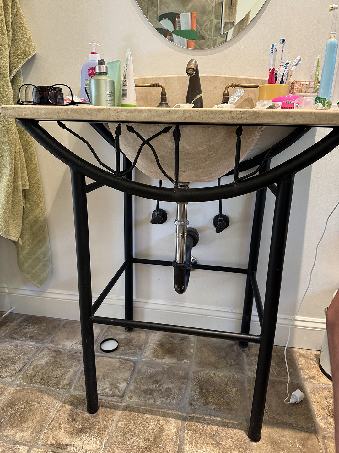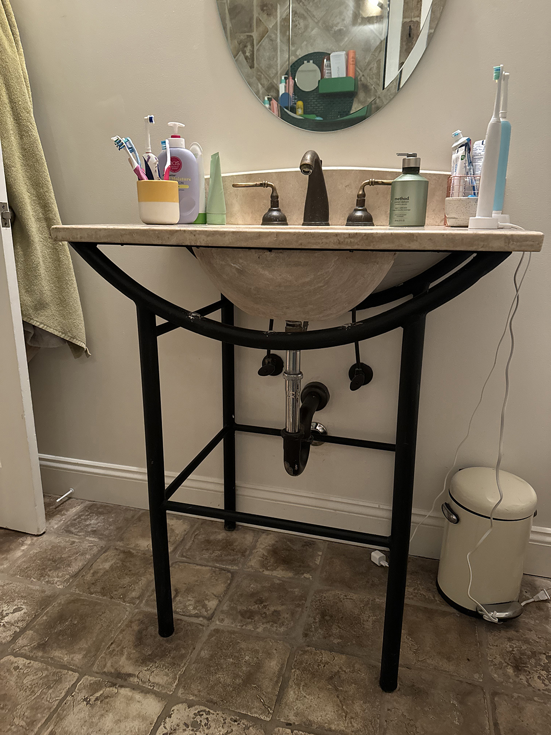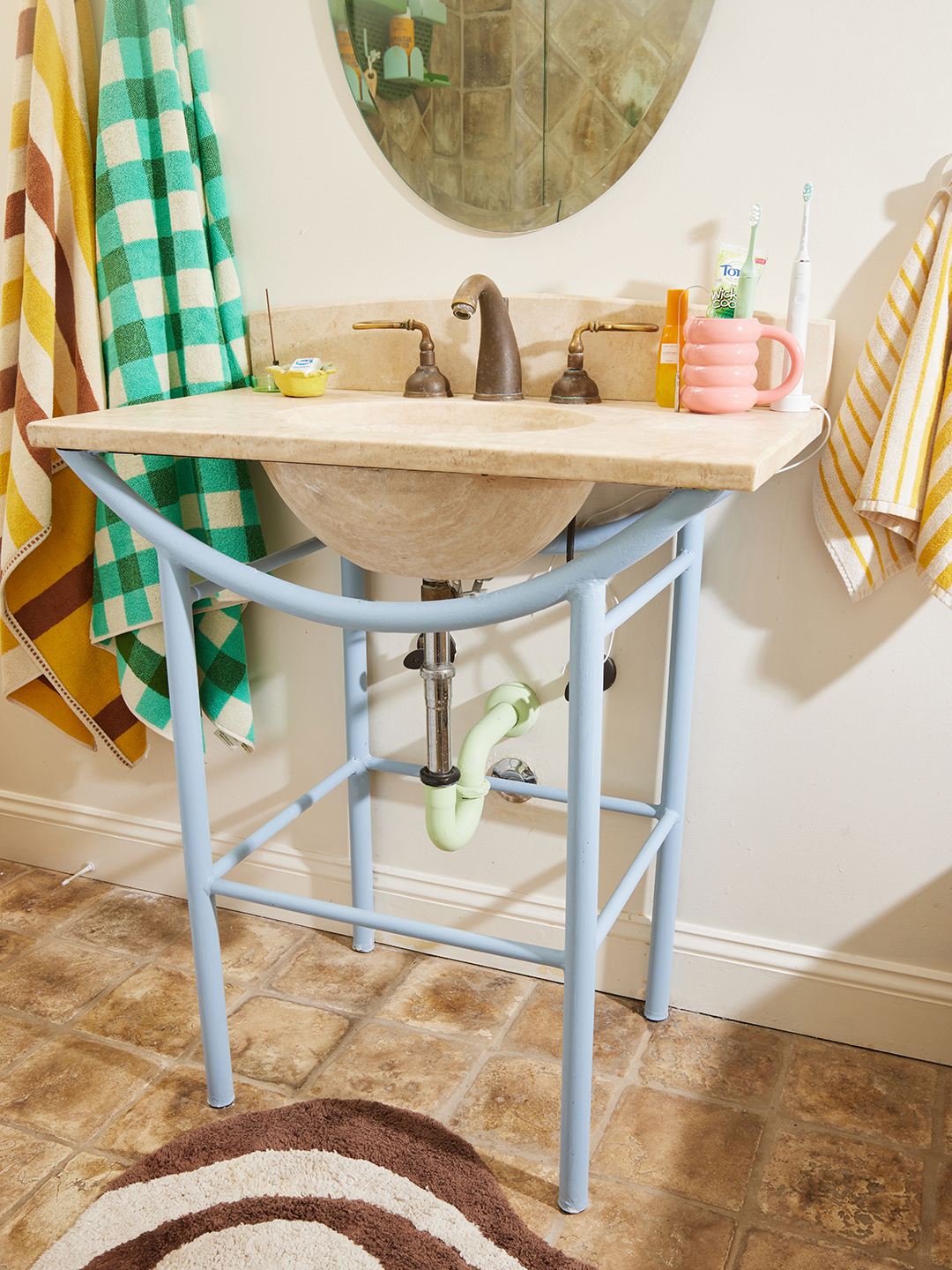 Removing the dated tiles and adjusting the tub or shower location was out of the question, but Fine could see the potential in the ’80s-coded sink that they inherited. She decided to use the bathroom’s neutral palette as a frame for colors that popped on the washstand. First up: the metal flowers on the front had to go first. Armed with a Dremel tool, pickleball goggles, and yellow kitchen gloves, she and son Indie filed them off clean.