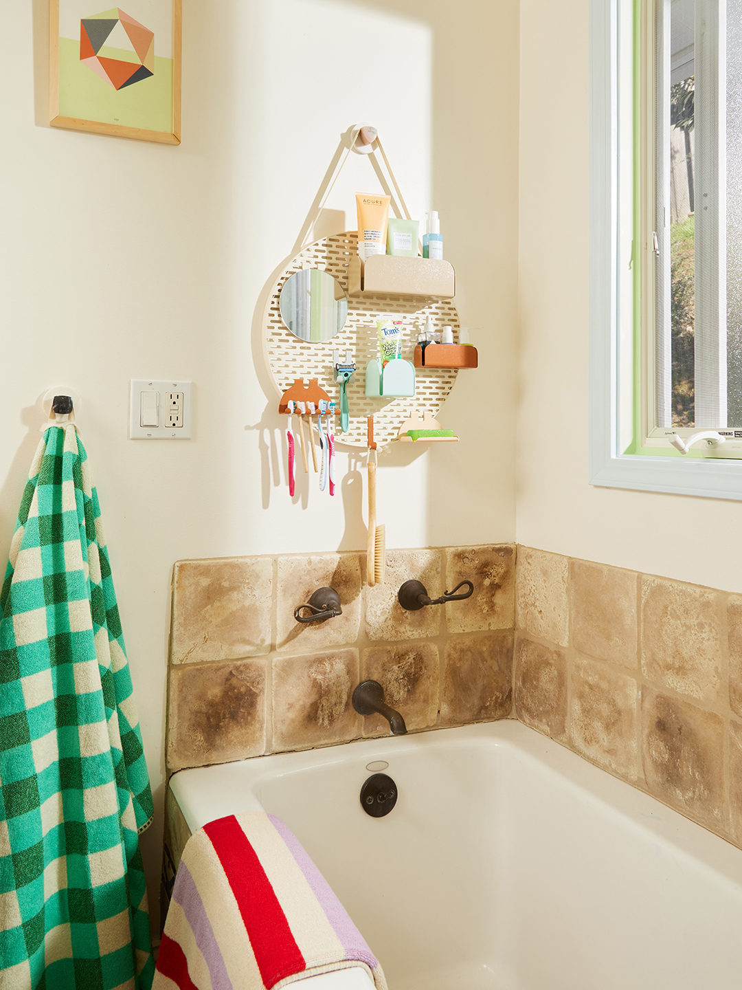 To finish off the refresh, Fine removed the wall sconce in favor of an Allied Maker pendant over the mirror, laid down a few of Quiet Town’s Lost Coast rugs to riff off the faux stone tiles with decorative waves, and then added hooks everywhere to hang their colorful towels like functional art, she says. She swapped in a lighter color of the Spot shower organizer, too. The renewed space is the definition of “work with what you have.”