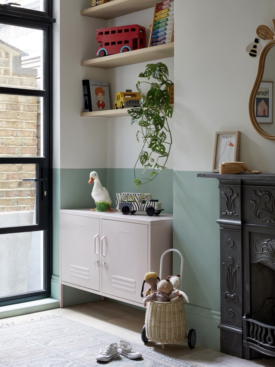Not only is a colorblocked half-wall a stellar option for color commitment–phobes, it can help create visual hierarchy. In this English nursery, designed by Born & Bred Studio, the crib and freestanding cabinet (not pictured) are both similar hues to the custom paint shade, encouraging them to fade somewhat into the background. Instead your eye is naturally drawn to the carved black fireplace and industrial floor-to-ceiling windows.