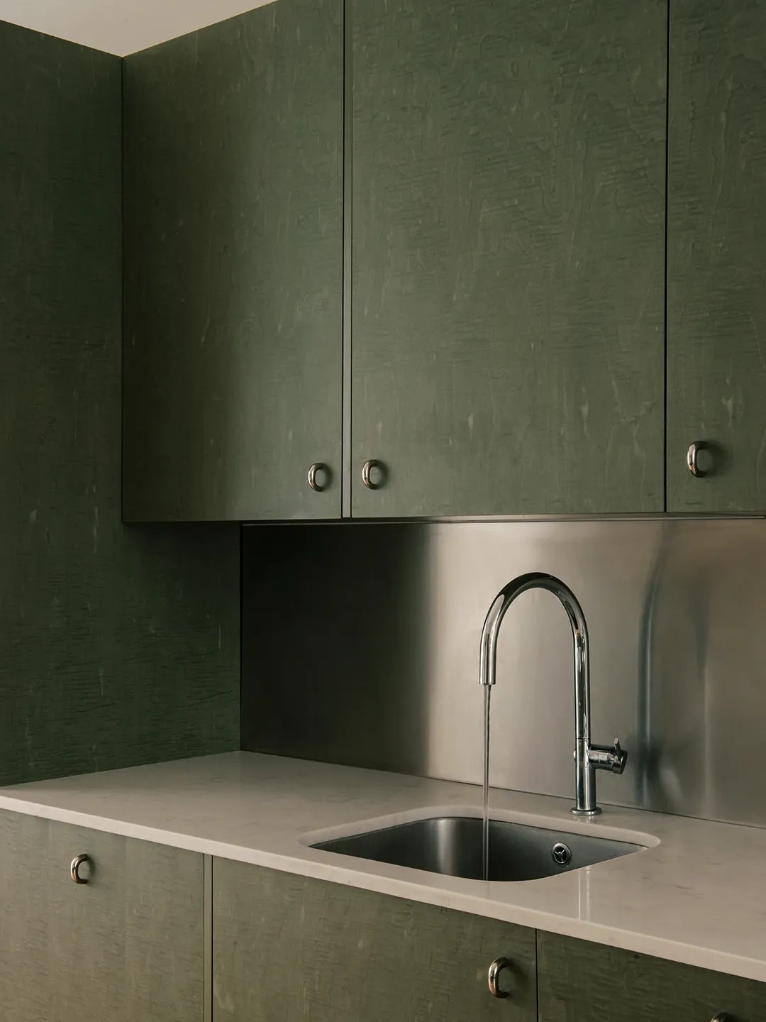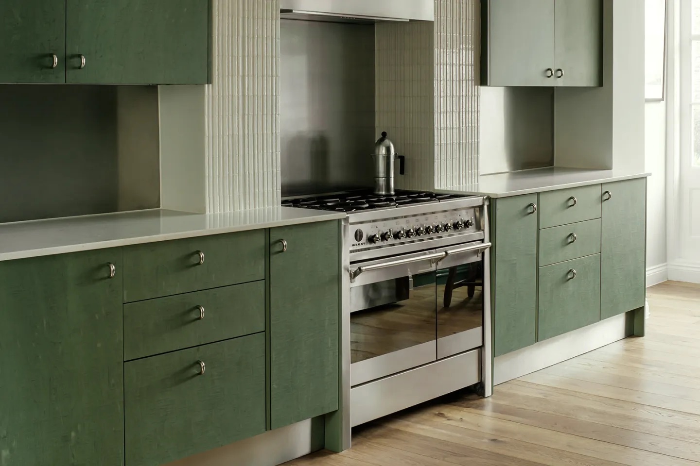 Knowing her client was obsessed with Emma Chamberlain’s green L.A. kitchen, designer Tabitha Organ put a spin on the look for his London renovation, swathing his tulipwood cabinets in a satiny green stain from Mundy Veneers. Her take reads a little futuristic thanks to the chunky polished nickel handles from Spaces Within as well as the contemporary flat slab doors.