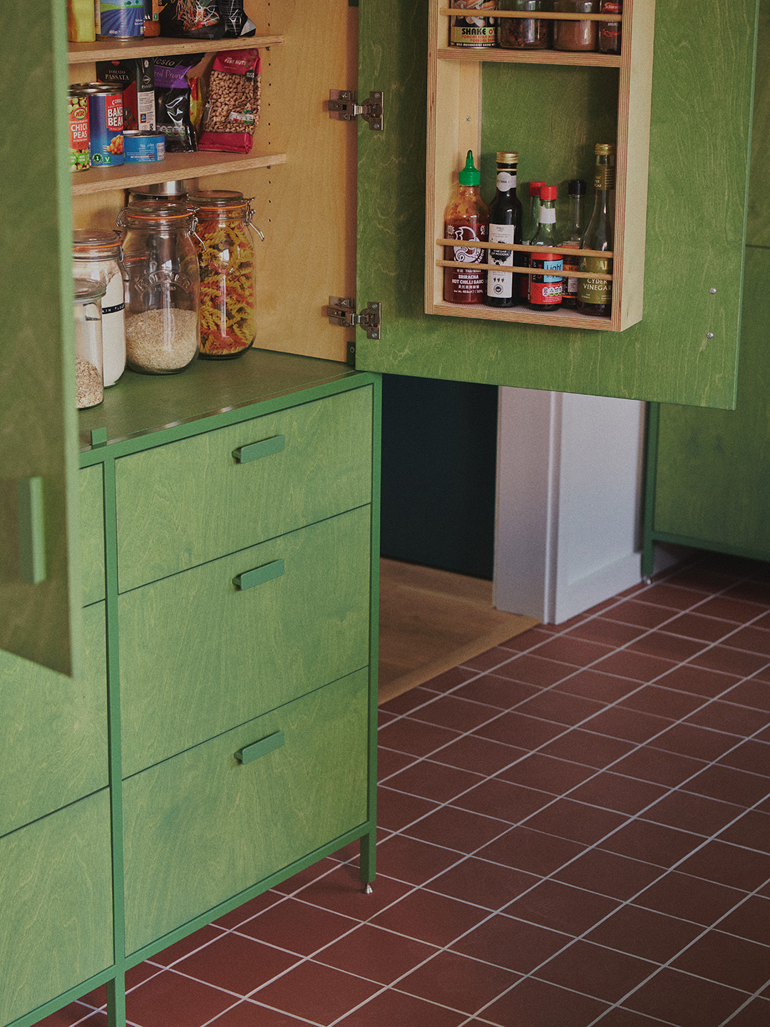 U.K.-based bespoke kitchen designer Jetsam Made pulled RAL 6011 (also called Reseda Green) for this space’s cabinets and powder-coated steel frame. The birch plywood fronts are swathed in OSMO oil wax for a natural, earthy finish. The catch: oil-based stains take a long time to dry, and each coat needs to be wiped back after it’s applied. Think of it like you’re slowly building layers over time.