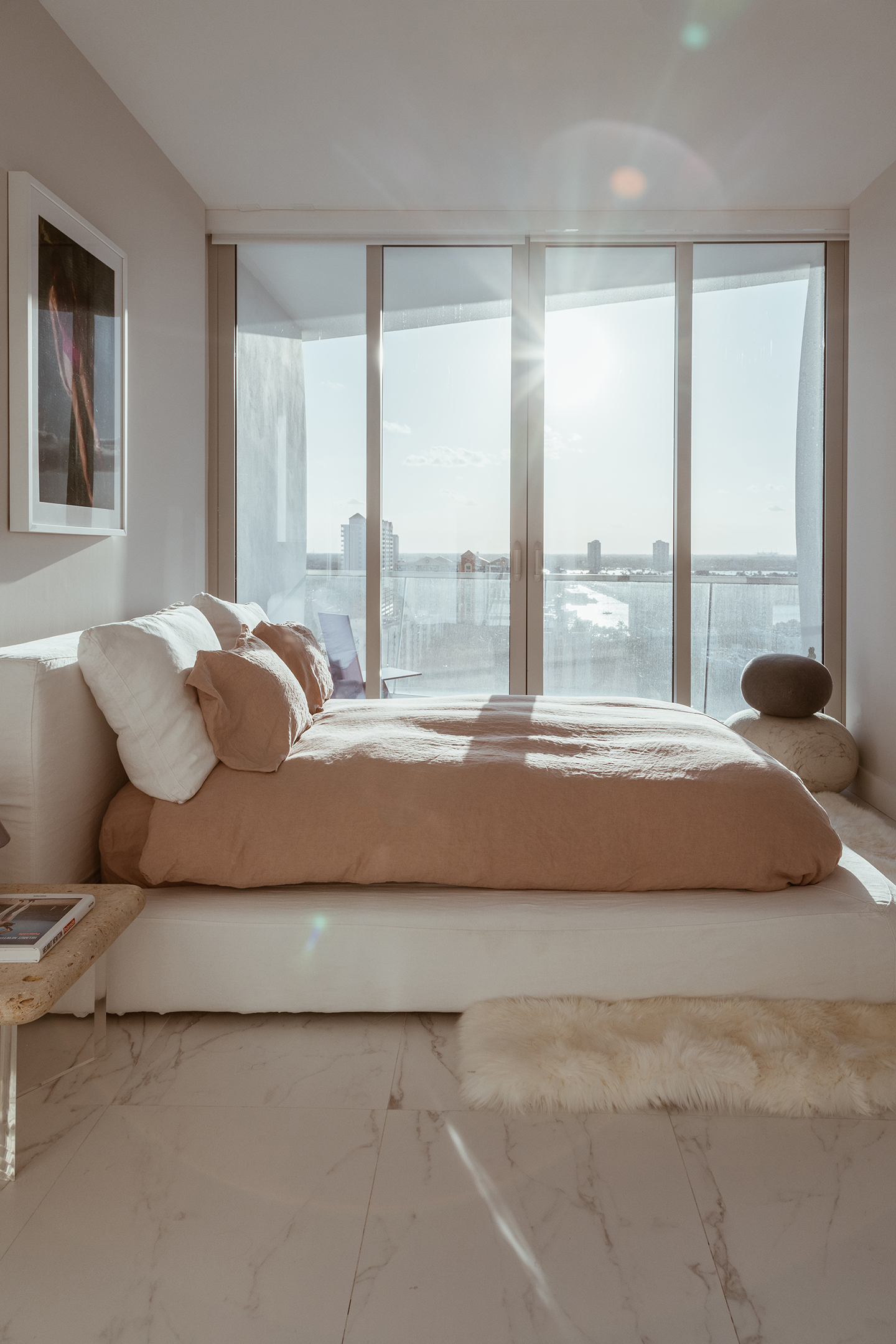 When I look back at all the calming bedrooms I’ve seen, it’s hard to forget Jena Covello’s Miami space. Her designer, Tiffany Howell, had visions of her client taking her morning tea on the balcony outside her room to catch the crashing waves, but I could easily picture doing the same from that ultra-low, loungey bed. While I knew we didn’t have enough room to go all out with a giant platform, I got hooked on the idea of a frame with a small bump-out around the mattress for that cocooning feel.