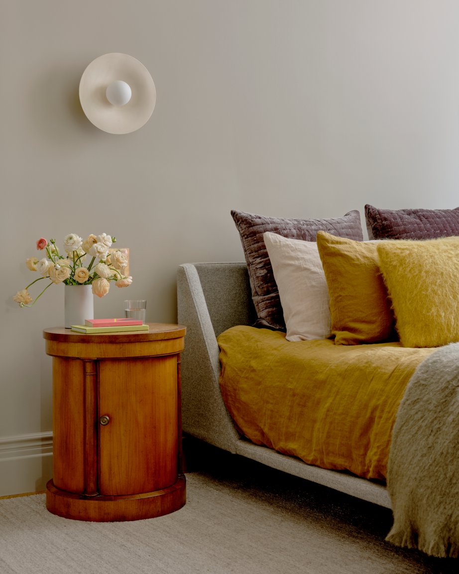 I wanted our space to feel as cozy and warm as one you’d see in a Nancy Meyers movie, so naturally I went way back in the Domino archives to reference this set-up belonging to the director’s daughter, Hallie Meyers-Shyer. The soft gray fabric fades into the backdrop, letting Meyers-Shyer play a little more with her bedding choices. I have a thing for patterned bedding (anything with a bold stripe is calling my name these days), so I decided a neutral color like this would feel timeless.
