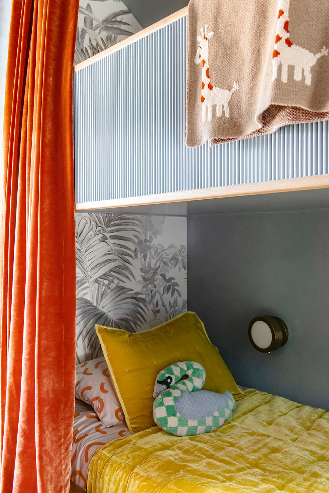 If bunk beds have visions of head bumps and long falls dancing in your head, peep Gatsby and Jazzy’s custom version. The pair of sleeping quarters is accessed by steps, not precarious ladders, and each has its own sconce should a storybook be on the agenda. “The idea is to install a projector screen over the window that’s in between the beds, so they can watch movies when they have sleepovers,” says Smith. When the credits roll, velvet curtains (in vivid orange, of course) turn each bunk into a cozy, private cocoon.