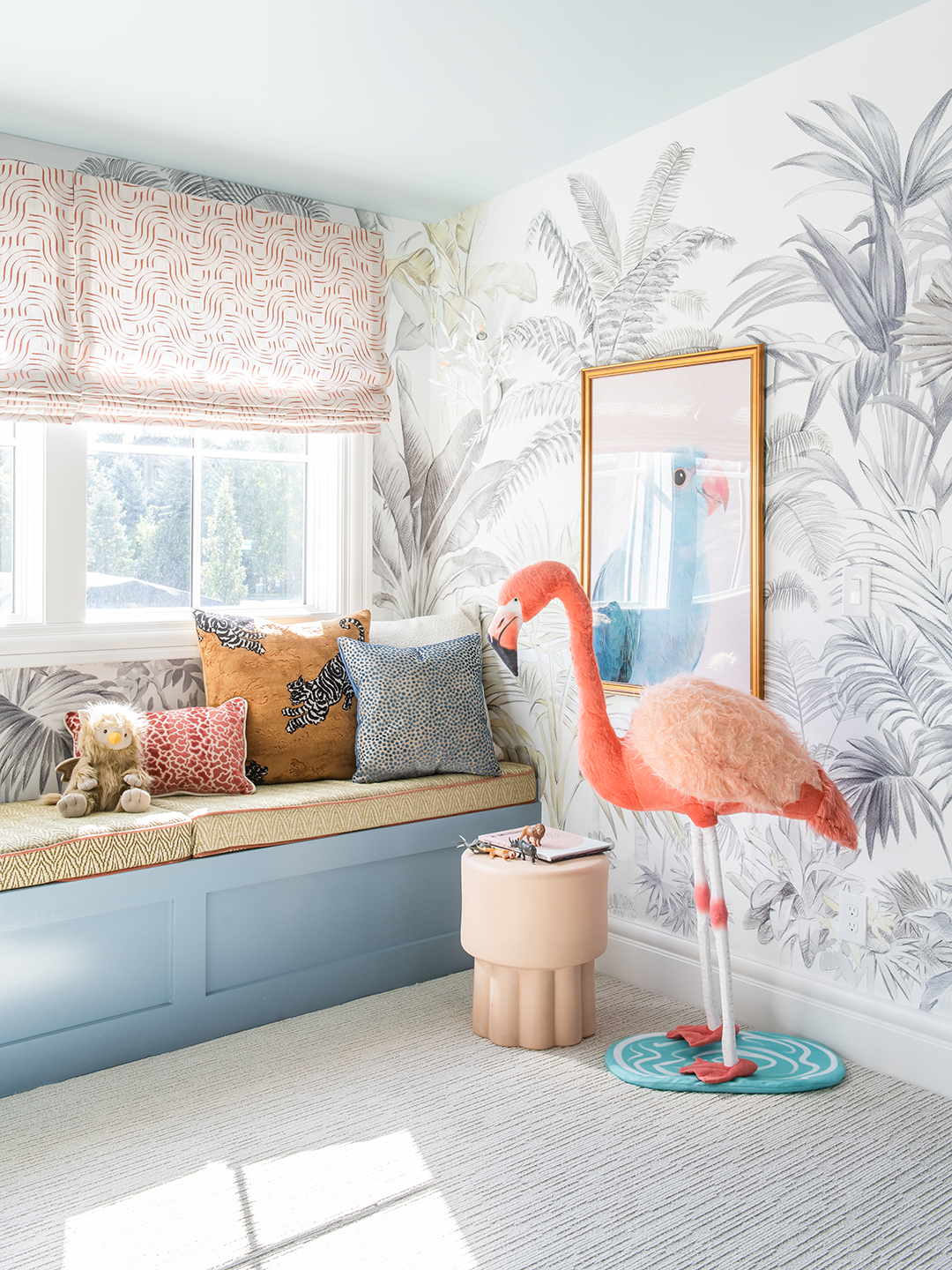 It’s standard decorating procedure: Choose your wallpaper, then pull a shade from the pattern to be your no-fail accent color. That’s what Aubrey Smith of Aubrey Veva Design planned to do when she and her client, mom-of-two Jessa Maddocks, landed on a whimsical jungle print for her kids’ playroom (Gatsby is 4; Jazzy is 2). Then “Jessa pushed me to something bolder,” says Smith, no surprise considering Maddocks is the founder and creative director of an inclusive fashion label known for its statement dresses. Tangerine it was.