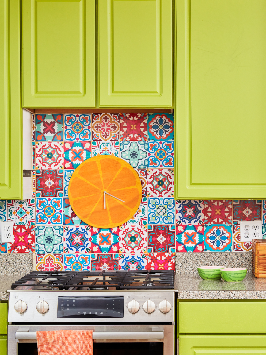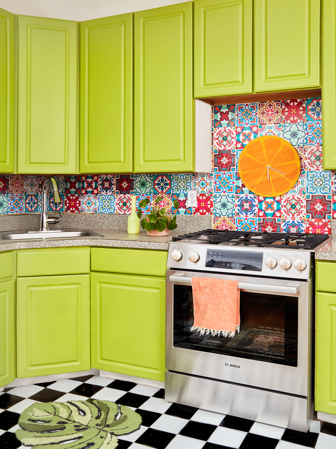 Even though I loved the size of my new space, I hated the kitchen. I started thinking of things I could do to make it more me. The cabinets were made from a composite covered in a thick, rigid white plastic-wrap type of sealant. I knew I wanted to repaint them, but you can’t paint over that hard plastic. I did a bunch of research and found that if I took my Dyson hair dryer to the edges, the sealant started to pull up and I was able to rip it all off. Because the cabinets weren’t real wood, I had to get a special white paint sealer and repaint them with the green. The whole process took me around two weeks. Inspired by Colorful Kimmes, I also added a peel-and-stick backsplash that I got on Amazon (funnily enough, my TikTok about it got 2.2 million views and the stickers sold out, so now I can’t replace them) and floor decals to cover the gray tile floor.