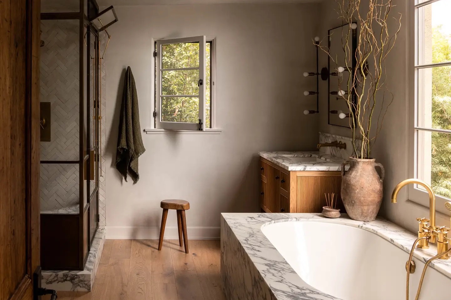 As for the doors, instead of one large glass partition, Corvino recommends two smaller doors that allow less steam to escape as you enter and exit. That’s the design she chose for her New Jersey brownstone bathroom. “Pivot hinges on double shower doors are a power move,” she states. They save on bathroom space, and when the doors are wet, she swings them inside the shower to dry off. Alternatively, designer Amber Lewis often favors multipane doors and glass, if that’s your thing, and she always fully encloses showers.