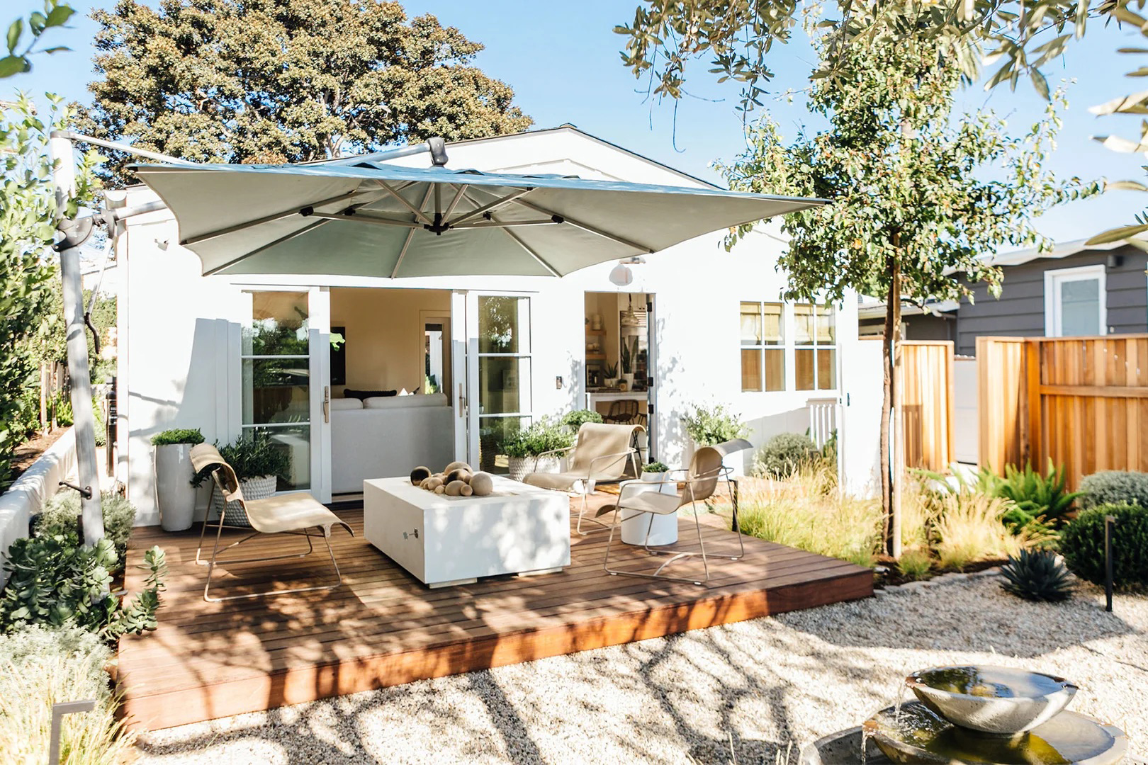 It might seem like you’re looking at the backyard of this San Clemente, California, bungalow, but (plot twist!) it’s actually the front. In this case, the zen courtyard is intended to be enjoyed by those who call it home (there’s a firepit, sun loungers, and a water fountain), and passersby get to enjoy the view. A major bonus? The maximized yard adds visual depth and interest to an otherwise minimalist exterior.