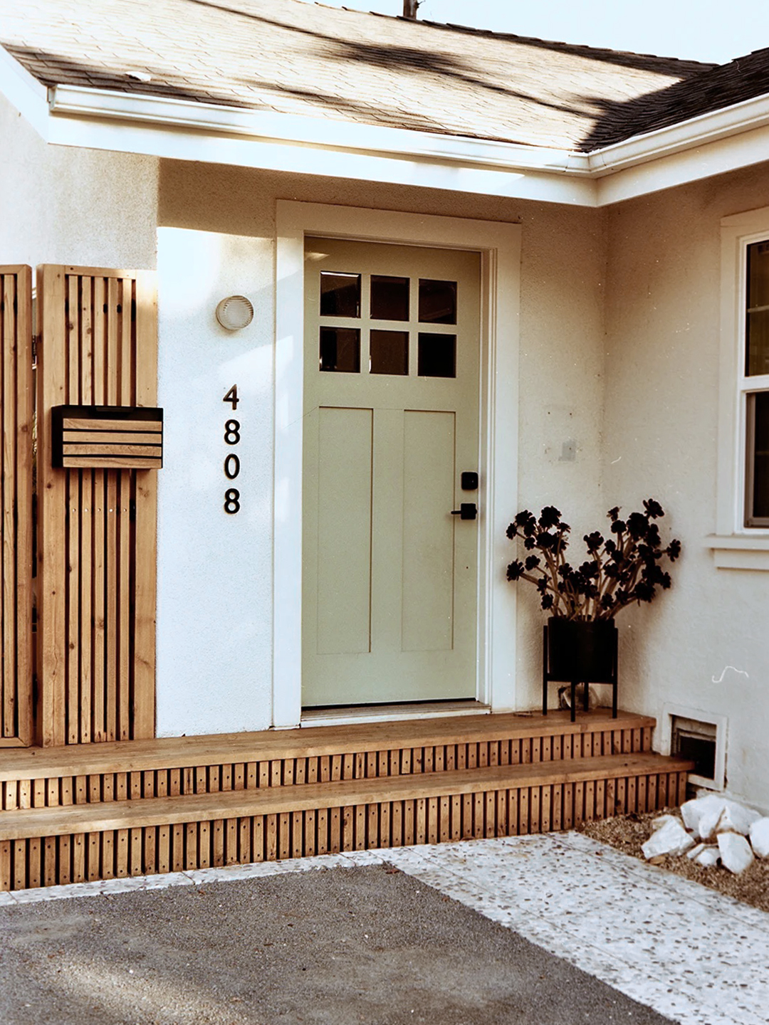 After a long stroll through his design client’s L.A. neighborhood, architect Anand Sheth realized that the new-construction homes on the block stuck out like sore thumbs because almost all of them had been painted black. The older residences on the street, however, were varying shades of lighter hues. So as to not stand in stark contrast with the community, he landed on a creamy white exterior—but left his stamp with a new sage green front door.